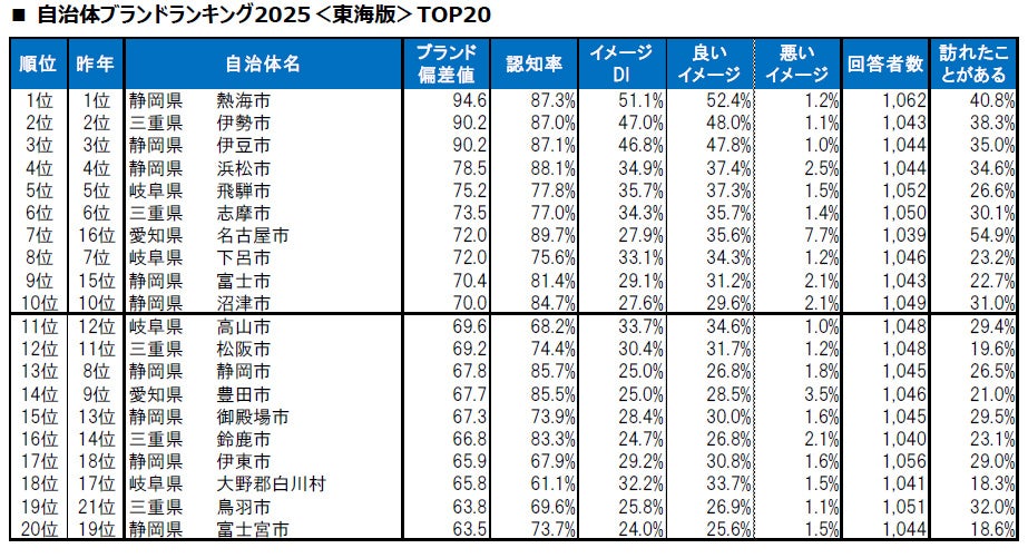 大東建託株式会社(本社:東京都港区、代表取締役 社長執行役員 CEO:竹内啓)は、18万人を超える回答を集めた大規模なブランド調査を行い、「いい部屋ネット 自治体ブランドランキング2025<東海版>」として集計しました。