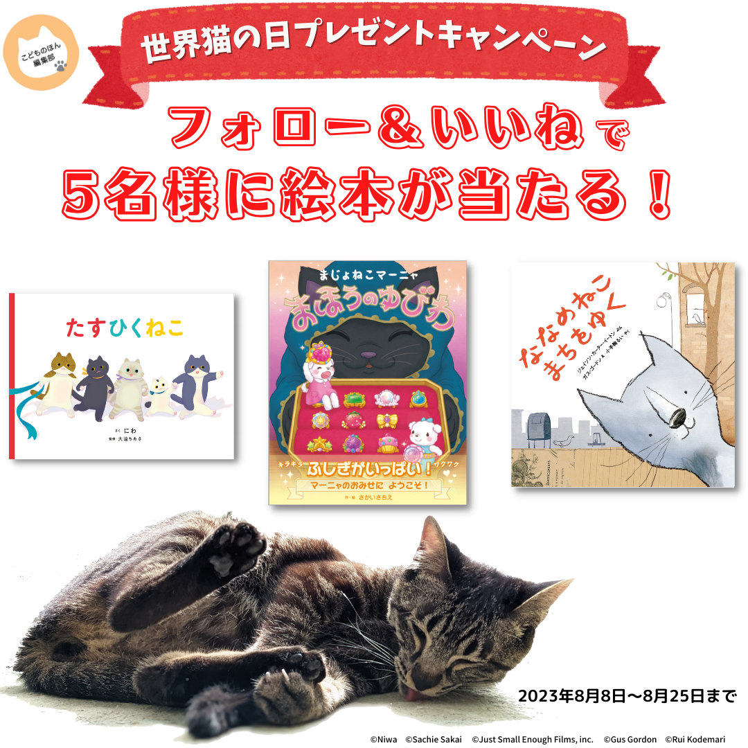 ・「世界猫の日プレゼントキャンペーン」では『たすひくねこ』『まじょねこマーニャ まほうのゆびわ』『ななめねこ まちをゆく』から1冊をプレゼント