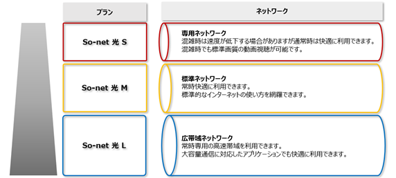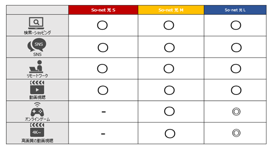 3つのプランはネットワークの設計が異なり、「So-net 光 S」は日中など混雑しない時間帯の利用がメインの方、「So-net 光 M」は混雑する時間帯でも快適に通信を利用したい方、「So-net 光 L」は大容量を必要とするコンテンツを利用する方に適しています。利用開始後に使い方が変化した場合でも、3つのラインアップから最適なプランに、回線工事の必要なく柔軟に切り換えることができます。