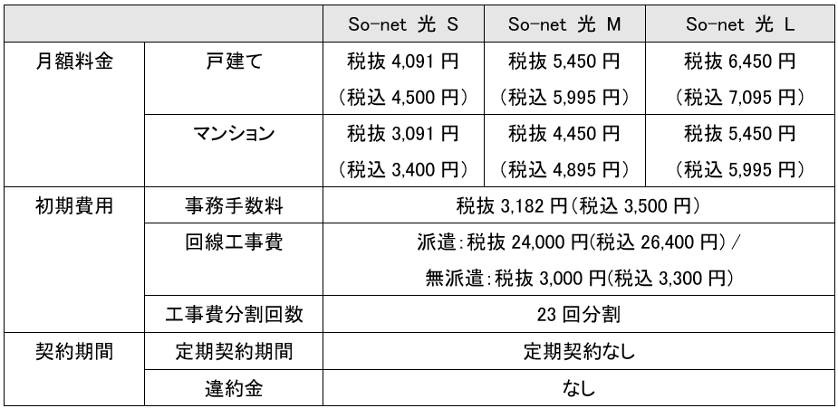 月額料金は、戸建ての場合、「So-net 光 S」税抜4,091円(税込4,500円)、「So-net 光 M」税抜5,450円(税込5,995円)、「So-net 光 L」税抜6,450円(税込7,095円)です。また、定期契約期間や違約金の設定はありません。