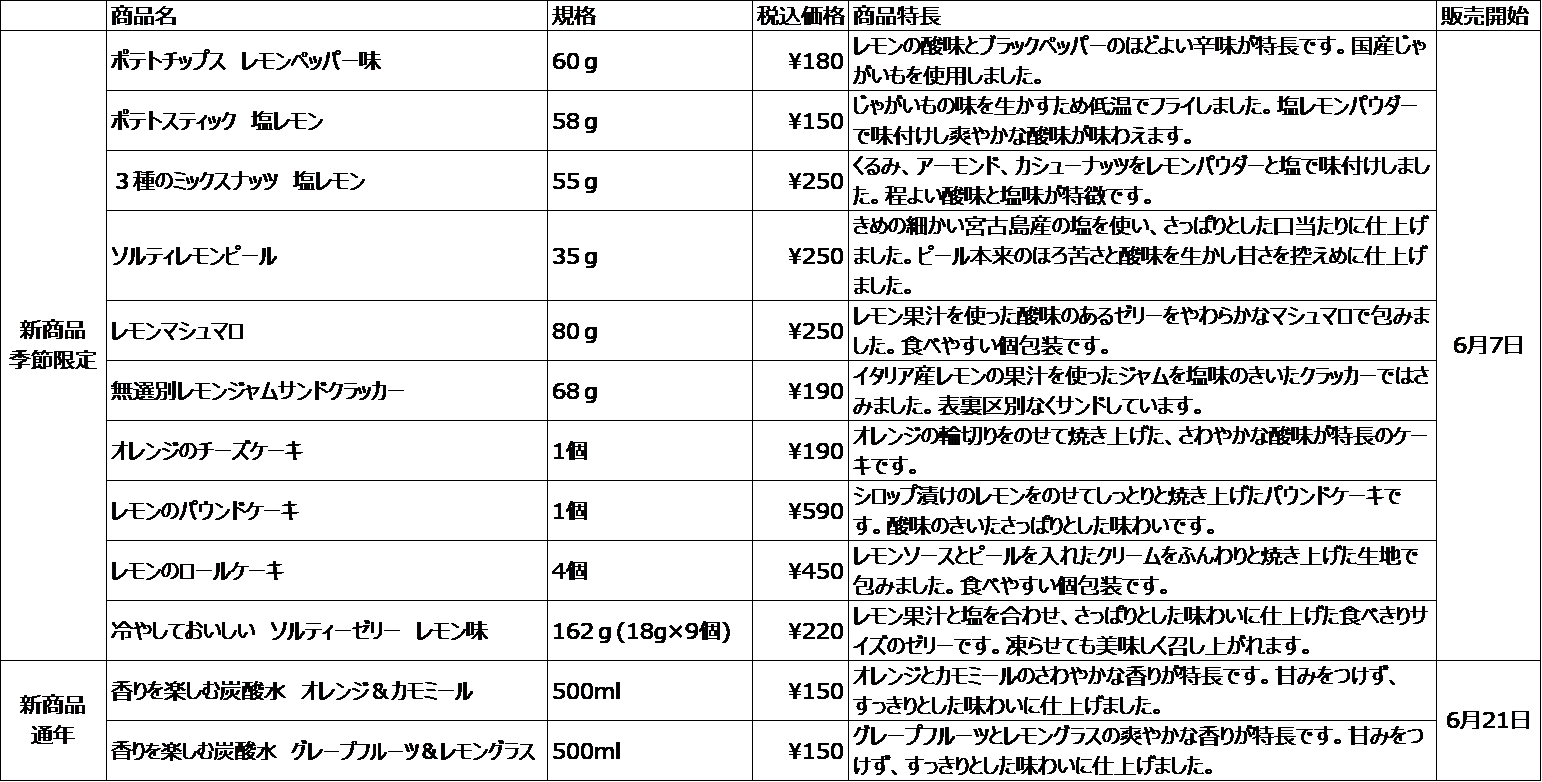 気分やシーンに合わせて選べるように、パウンドケーキやロールケーキなどの定番のお菓子だけでなく、ポテトチップスやミックスナッツなど、おつまみにもなるスナック菓子も用意しました。暑い夏でも食べやすいよう甘みと酸味のバランスを考え、さっぱりとした味わいの商品に仕立てました。素材の味も楽しめるよう工夫しています。「ソルティレモンピール」は、宮古島産のきめの細かい塩を使用することで、適度な塩分を加えつつレモンピール本来の苦みを楽しんでいただけるようにしました。「ポテトスティック」は、じゃがいもの味を生かすため低温で揚げ、レモンパウダーで味付けしました。