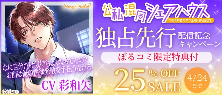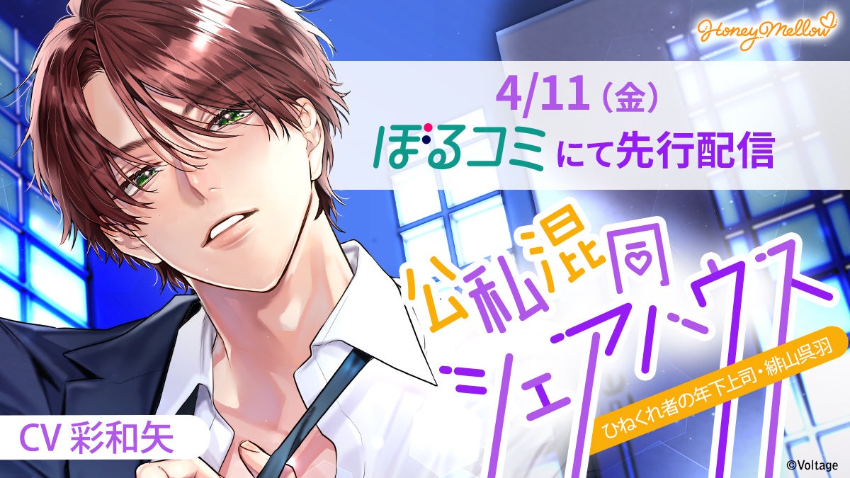 株式会社ボルテージ(本社:東京都渋谷区 代表取締役:津谷 祐司)は、シチュエーションボイスドラマレーベル「Honey Mellow」の「公私混同」シリーズの緋山編である「公私混同シェアハウス ~ひねくれ者の年下上司・緋山呉羽」 (CV.彩和矢)を電子コミックストア「ぼるコミ」にて4月11日(金)より先行配信を開始したことをお知らせいたします。