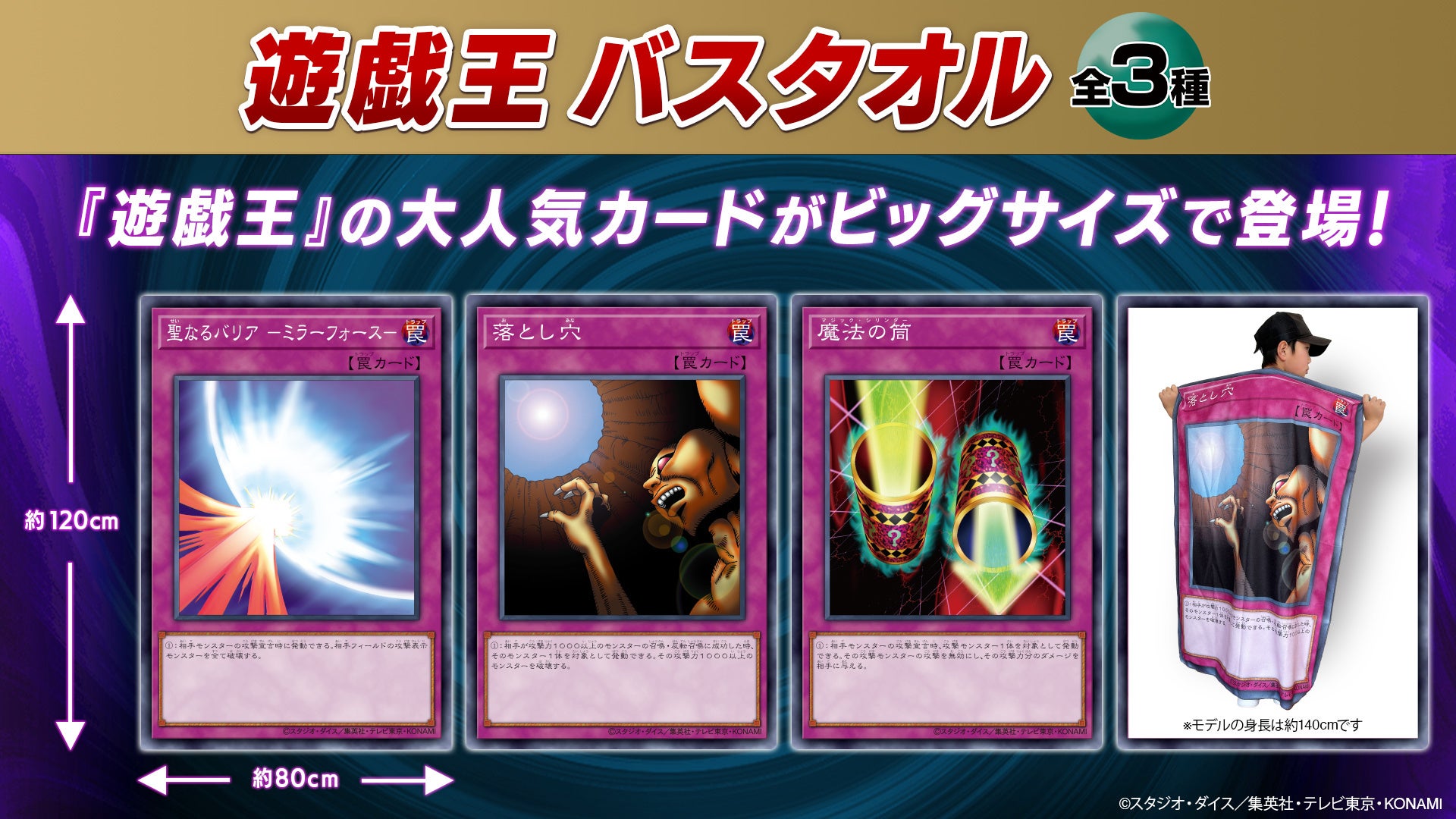 「遊戯王」から大人気カードが超大判バスタオルになって登場!!存在感のある約120cmのBIGサイズで大胆にカードを再現しました。お家でも旅行先でも大活躍なバスタオルです。