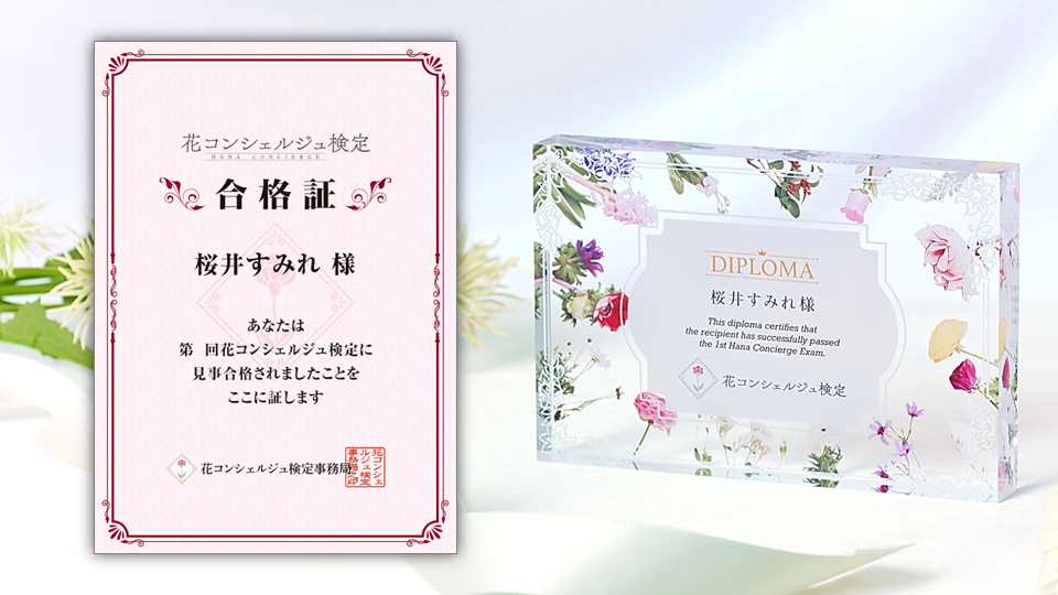 見事合格された方には、その成果を称え、もれなく「合格証」を贈呈いたします。 さらに、希望者の方に限り、世界に一つだけのお名前入り「特製ディプロマ」を限定販売いたします。透き通ったアクリルブロックに色とりどりの花をあしらった、気品あふれるデザインは、第1回でも大変ご好評をいただきました。 栄えある合格の証として、また花と向き合った楽しい学びの時間の思い出として、お部屋に飾って長くお楽しみいただける一品です。