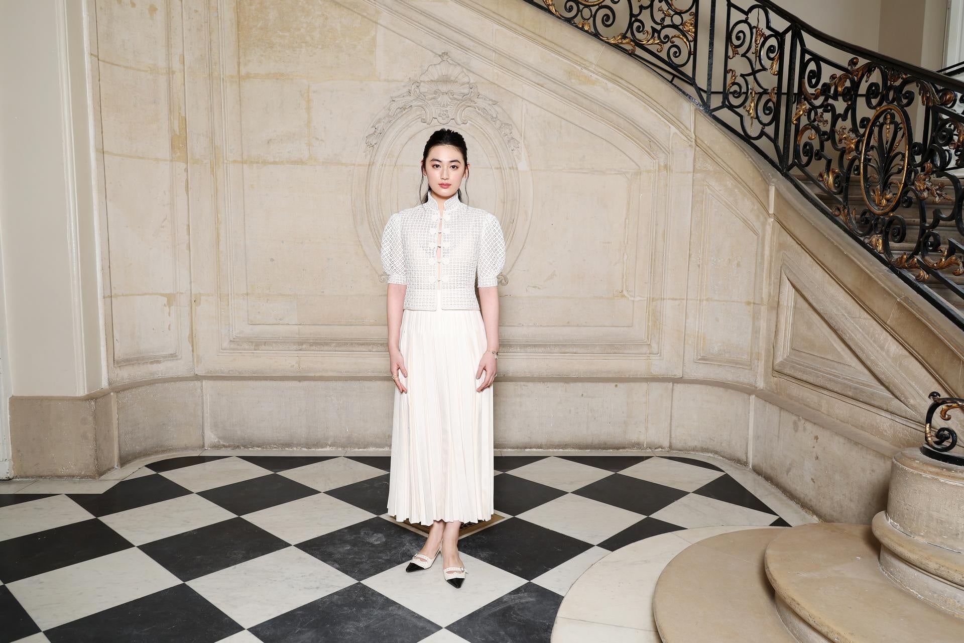 エリザベス・デビッキは、2024年春夏 ウィメンズ コレクションより、アシンメトリーのホワイトシャツとコットンのホワイトパンツ、シューズを合わせています。また、ディオール ファイン ジュエリーより「ボワ ドゥ ローズ」のイヤカフとブレスレットを纏いました。