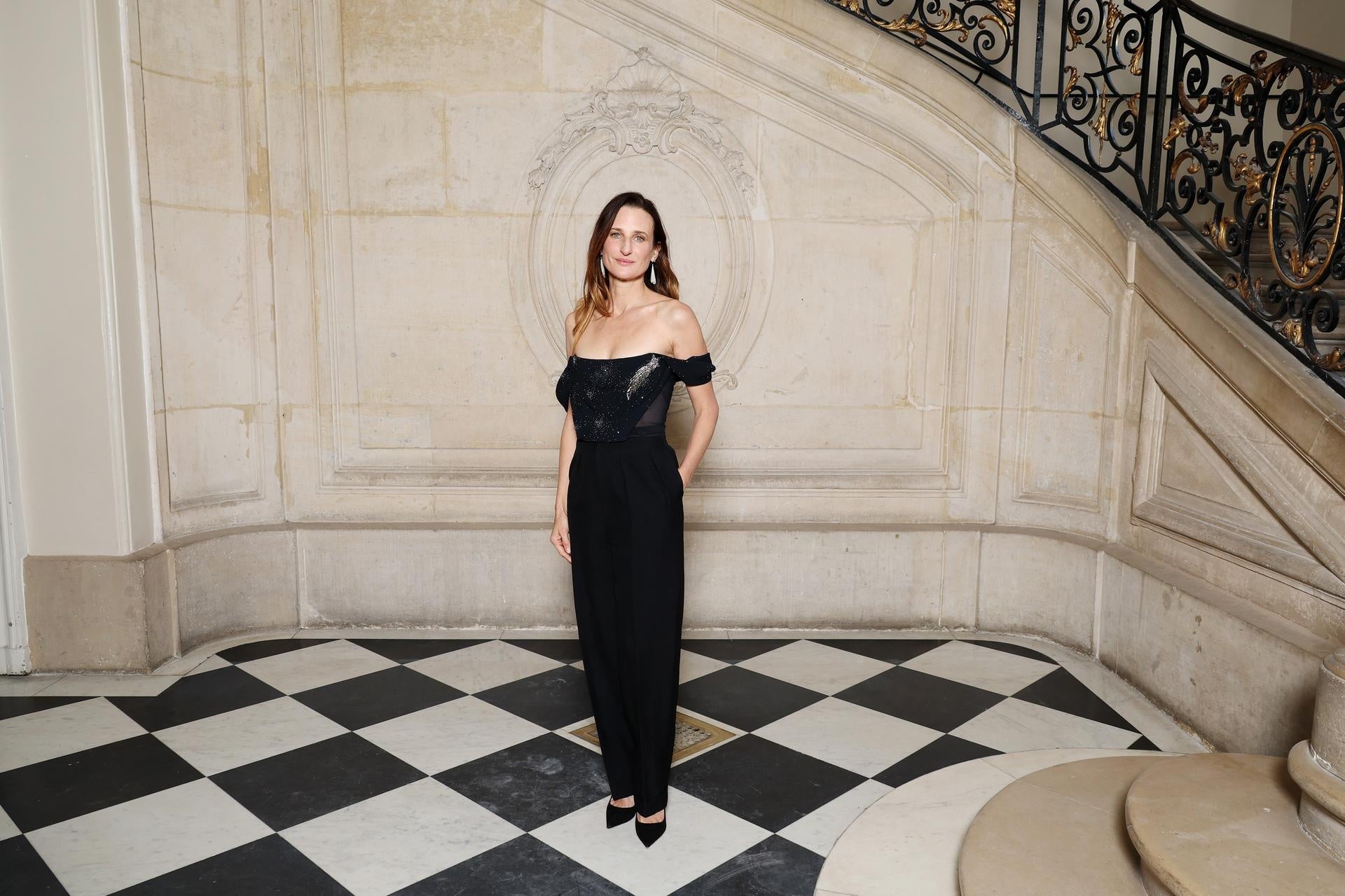 カミーユ・コッタンは2024年プレフォール コレクションより、シルクのブラックトップスとパンツを身に纏い、ました。