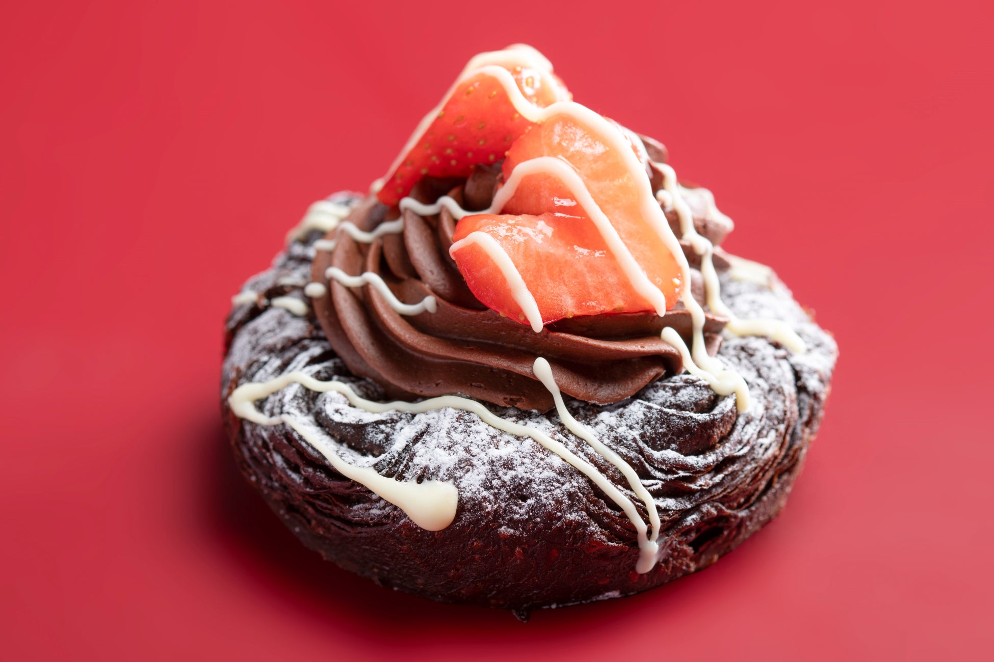 サクサクのココアデニッシュに口どけの良い生チョコレートといちごをトッピングしました。ほろ苦いチョコレートといちごのさわやかな酸味が絶妙です。