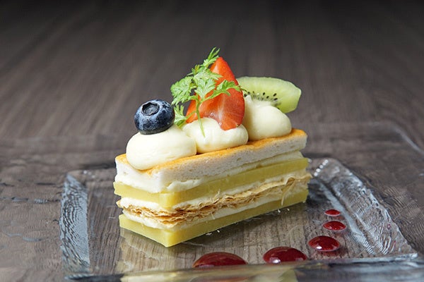 しっとりした芋ようかん、サクサクのパイ生地、ふわふわの生クリームスポンジ。食感の違う素材を重ねて、ここでしか味わえないミルフィーユを作りました。 芋ようかんと同じ素材のさつまいもペーストは糖度の違う2種を使用。最後まで変化を楽しめる一皿です。