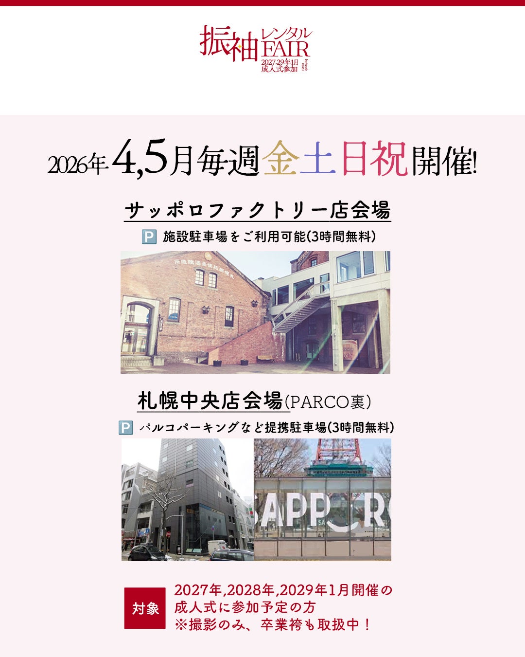 北海道を拠点にフォトスタジオ・振袖レンタルサービスを展開する写真工房ぱれっとは、2026年4月、5月毎週金土日祝にて、札幌エリアの2会場「サッポロファクトリー店」「札幌中央店」にて、振袖レンタルフェアを開催いたします。