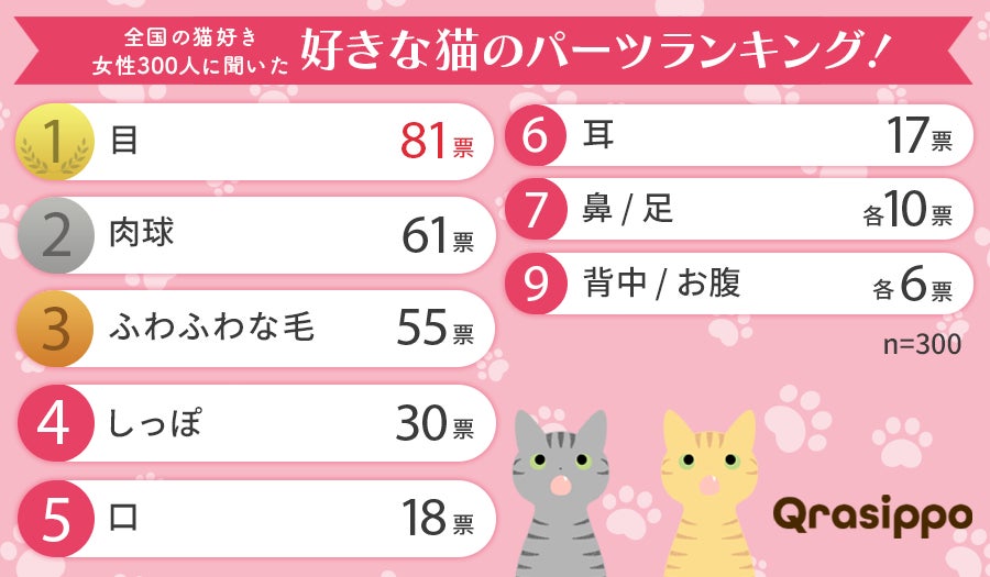 今回は事前調査で「猫が好き」と回答した全国の猫が好きな女性300人を対象に『好きな猫のパーツ』についてアンケートを実施。