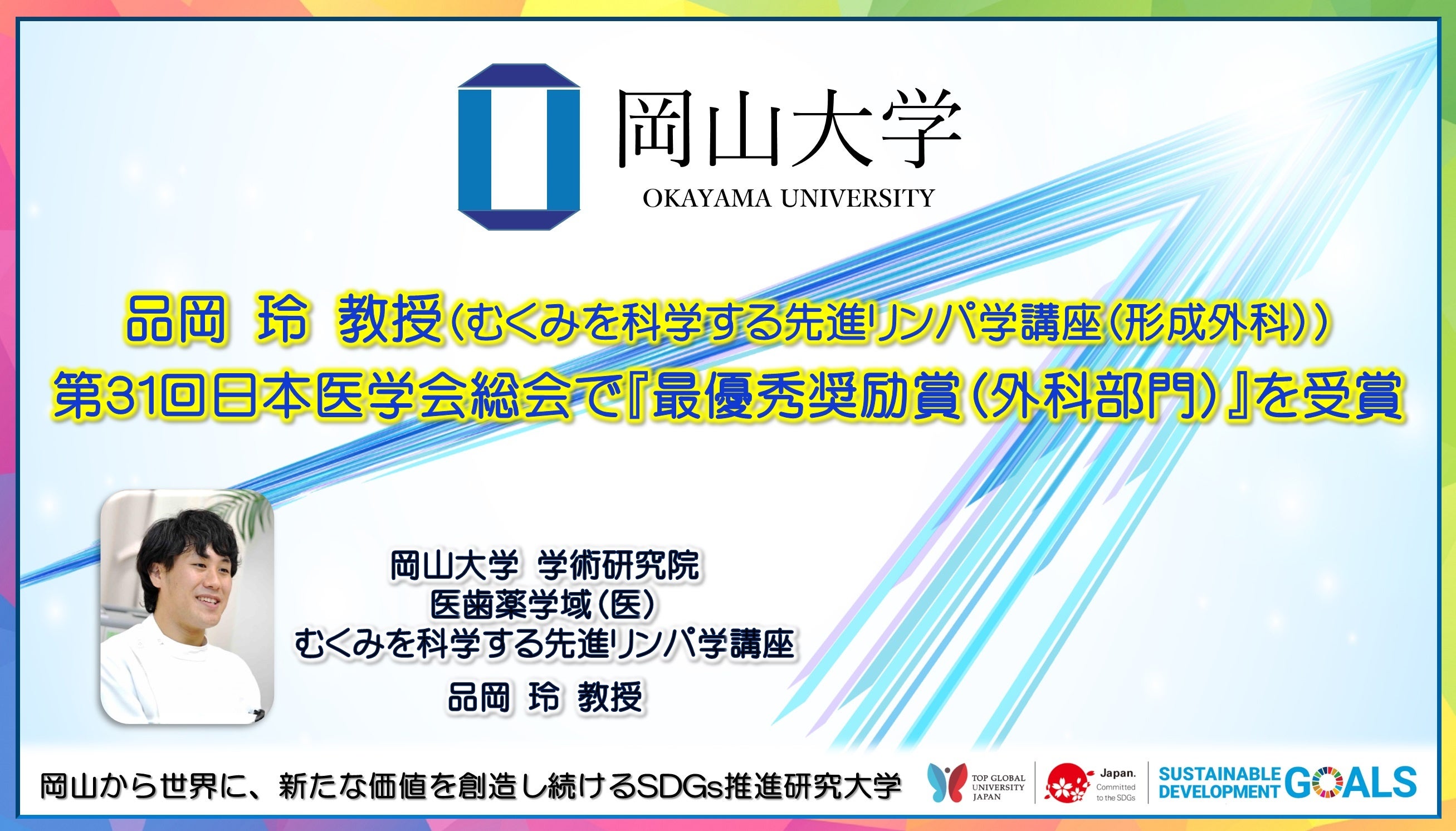 国立大学法人岡山大学(本部:岡山市北区、学長:那須保友)のむくみを科学する先進リンパ学講座(形成外科)の品岡玲教授が、「第31回日本医学会総会」において医学上、優れた業績を上げた若手研究者を顕彰する「日本医学会奨励賞」を受賞し、2023年4月23日に東京で受賞者講演を行いました。さらに外科領域受賞者5人の中から、審査の上、最優秀奨励賞に選ばれました。