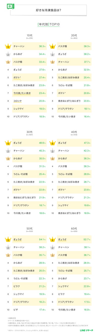 10代・20代は炭水化物系の「チャーハン」「パスタ類」がそれぞれ1位。30代以降では主菜の「ぎょうざ」が1位