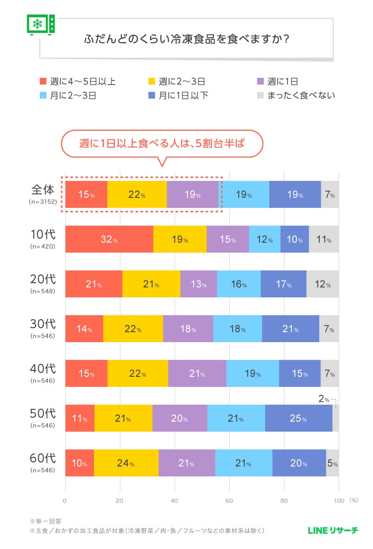 【LINEリサーチ】週に1日以上冷凍食品を食べる人は5割台半ば、10代は6割台後半で食べる頻度が最も高い結果に