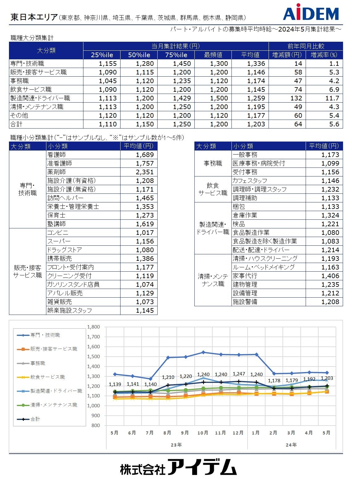 総合人材情報サービスの株式会社アイデム(本社:東京都新宿区 代表取締役社長:椛山 亮)は、求人メディア『イーアイデム』や採用ホームページ構築サービス『Jobギア採促』を利用して公表された求人情報から、2024年5月のパート・アルバイト募集時平均時給を集計いたしました。
