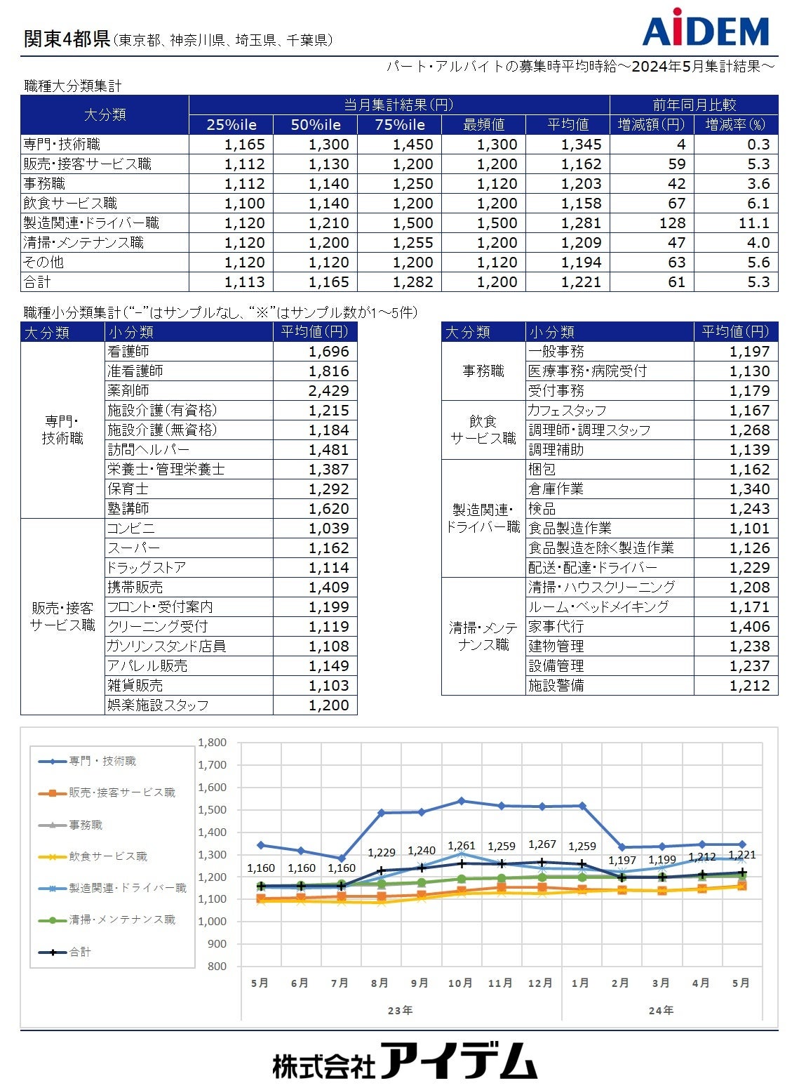 職種大分類別の平均時給は、「専門・技術職」1,345円(前年同月比4円増)、「製造関連・ドライバー職」1,281円(同128円増)、「清掃・メンテナンス職」1,209円(同47円増)、「事務職」1,203円(同42円増)、「販売・接客サービス職」1,162円(同59円増)、「飲食サービス職」1,158円(同67円増)の順で、前年同月比で全ての職種がプラスとなった。都県別の平均時給は、東京都1,250円(前年同月比57円増)、神奈川県1,225円(同50円増)、千葉県1,177円(同69円増)、埼玉県1,165円(同51円増)の順となり、前年同月比で全ての都県がプラスとなった。