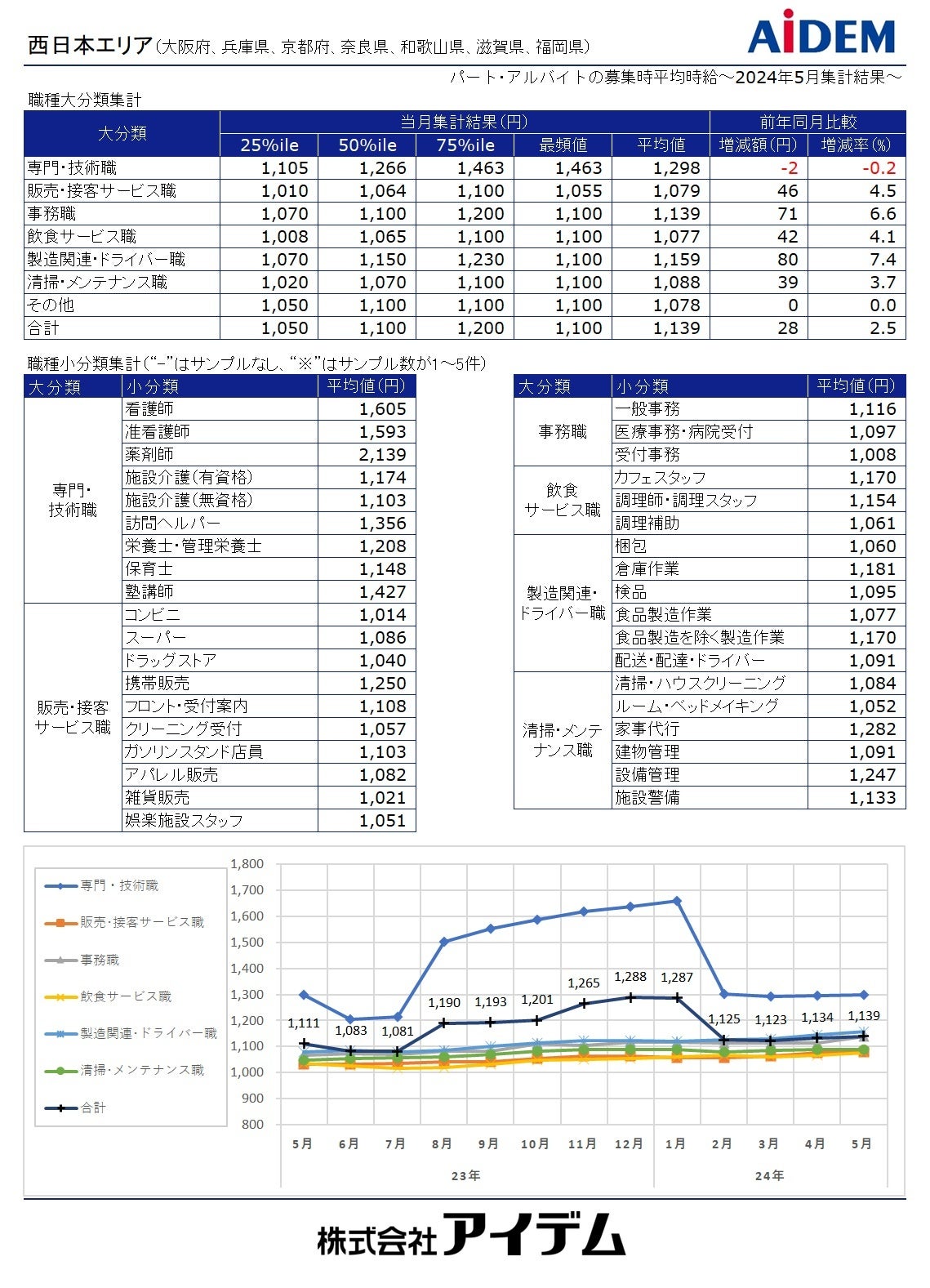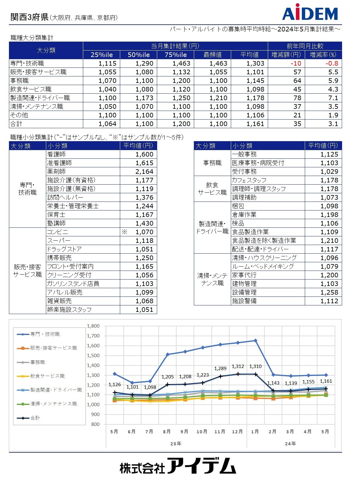 職種大分類別の平均時給は、「専門・技術職」1,303円(前年同月比10円減)、「製造関連・ドライバー職」1,178円(同78円増)、「事務職」1,145円(同64円増)、「販売・接客サービス職」1,101円(同57円増)、「飲食サービス職」1,098円(同45円増)、「清掃・メンテナンス職」1,098円(同37円増)の順で、前年同月比でプラスが5職種、マイナスが1職種となった。府県別の平均時給は、大阪府1,196円(前年同月比24円増)、兵庫県1,128円(同54円増)、京都府1,107円(同21円増)の順となり、前年同月比で全ての府県がプラスとなった。
