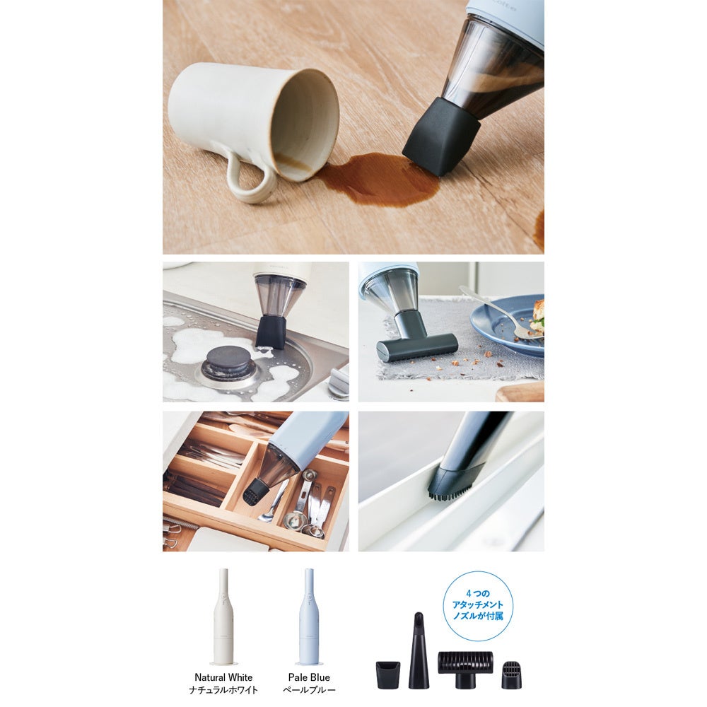 (本体+スタンド)幅12奥行12高さ39cm・重さ0.75kg ■ABS樹脂 ■充電時間約4時間 ■連続使用可能時間…Hiモード約15分/Loモード約20分 ■セット内容…本体、スタンド、ウェットノズル、先細ブラシノズル、ファブリックノズル、格子ノズル、専用USBケーブル ■中国製