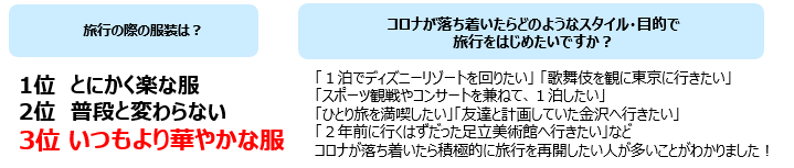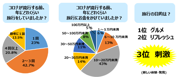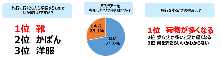 今回の調査によると、「コロナが流行する前、年にどれくらい旅行をしていましたか?」という質問に対し、4回以上の人が20.8%、2~3回の人が42.7%と、60代女性の6割以上が年に何度も旅行に行っていたことがわかりました。旅の目的は、1位「グルメ」、2位「リフレッシュ」に続き3位には「刺激」がランクイン。“新しい体験をしたい”“新しい発見をしたい”“新しいものに触れたい”という声が多く挙がりました。年間の旅行予算は10~20万円未満の人が一番多く、最高額は200万円。お小遣いは、5万円以上の人が大半を占め、58.3%の人が旅行の準備で毎回何かしら新しいアイテムを買うと回答。旅行準備で欲しいものは、1位「靴」、2位「かばん」、3位「洋服」でした。旅行の際の服装は36.5%の人が「とにかく楽な服を着る」、21.9%の人が「いつもより華やかな服を着る」と回答し、旅行の悩み1位は「荷物が多くなる」(55.2%)、2位は「歩くことが多いと足が痛くなる」(35.4%)、3位は「何を着たらいいかわからない」(11.5%)という結果になりました。