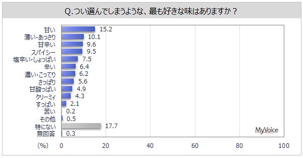 つい選んでしまう最も好きな味は、「甘い」が15.2%、「薄い・あっさり」が10.1%、「甘辛い」「スパイシー」が各1割弱です。