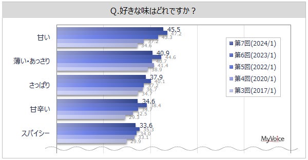 <今 回>(2024/1)https://myel.myvoice.jp/products/detail.php?product_id=30604 上記設問の他に、「好きな味のベース」も聞いています。 <第6回>(2023/1)https://myel.myvoice.jp/products/detail.php?product_id=29403 <第5回>(2022/1)https://myel.myvoice.jp/products/detail.php?product_id=28206 |