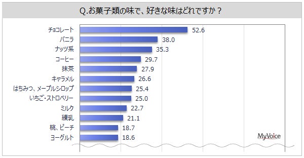 お菓子類の味で好きな味は(複数回答)、「チョコレート」が52.6%、「バニラ」が38.0%、「ナッツ系」が35.3%です。