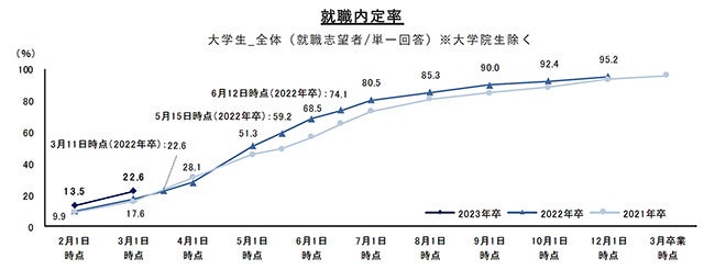就職プロセス調査 (2023年卒)「2022年3月1日時点 内定状況」就職内定率は22.6%、前年同月差は+5.0ポイント。企業の選考活動開始時期が早まり、例年以上のペースで内定率が推移