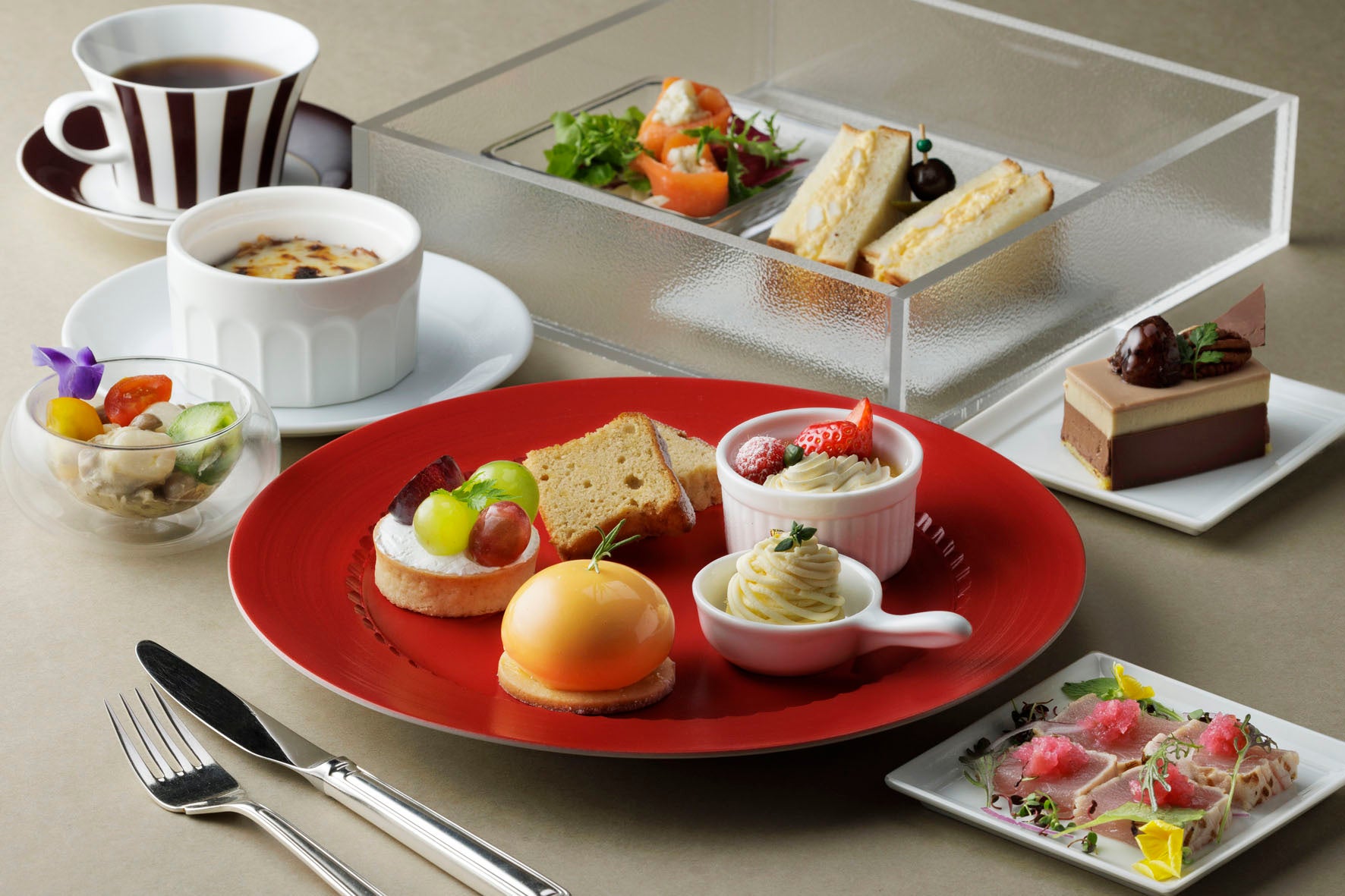 季節ごとにメニューを変えお届けしているアフタヌーンティー「マルノウチジカン」は、今回よりバージョンアップ!充実のセイボリー5品とスイーツ5品にくわえて、別皿のスイーツが1品増え、なんと6品になりました。旬の素材をアレンジしたさまざまな料理とともに、カメリアオリジナルのフレーバーアイスティーをはじめ、ハーブティーやこだわりのコーヒーなど、お好みのドリンクをお好きなだけお楽しみいただけます。
