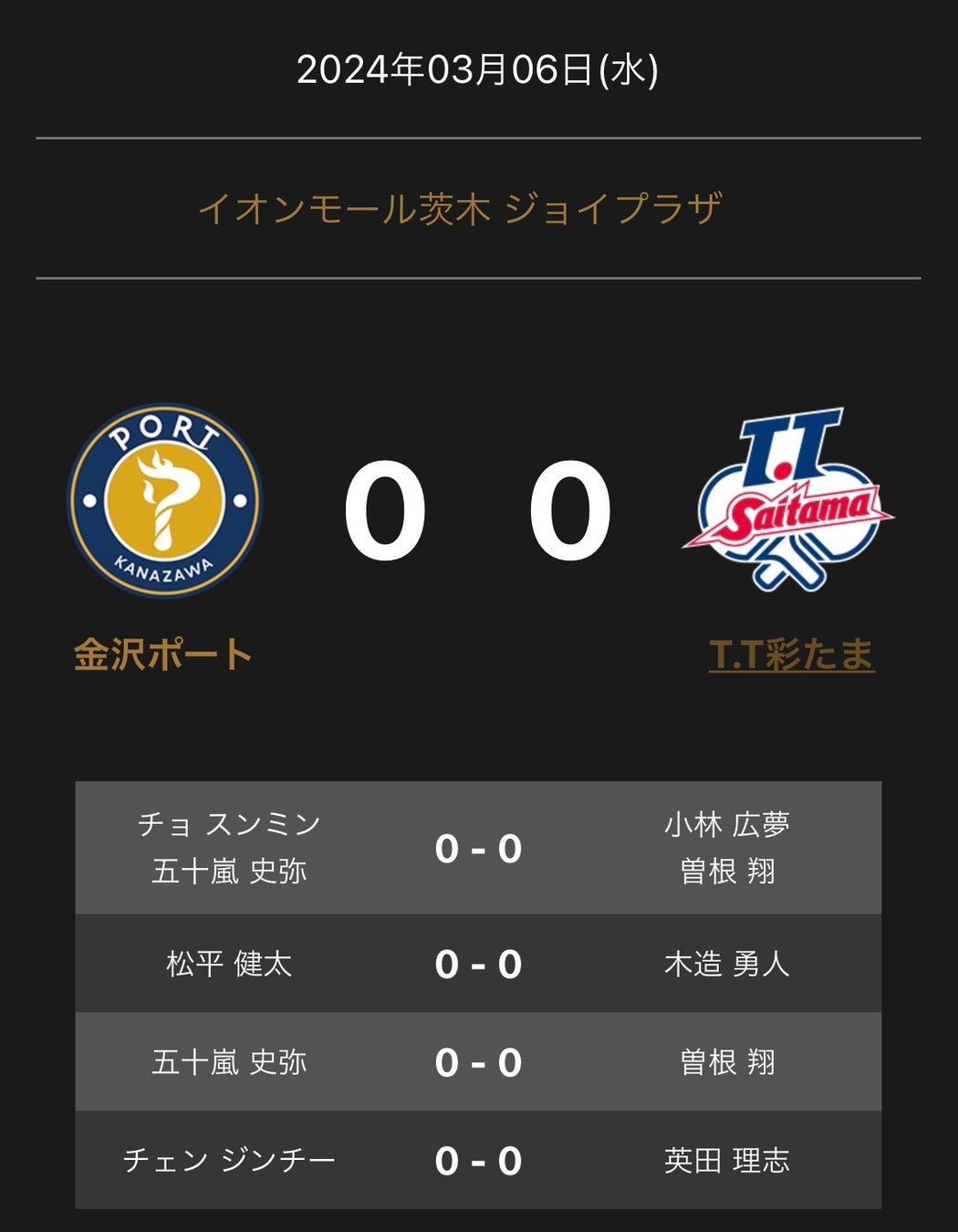 ノジマTリーグ 2023-2024シーズン 公式戦 3月6日開催 金沢ポート vs TT.彩たま 対戦オーダー発表