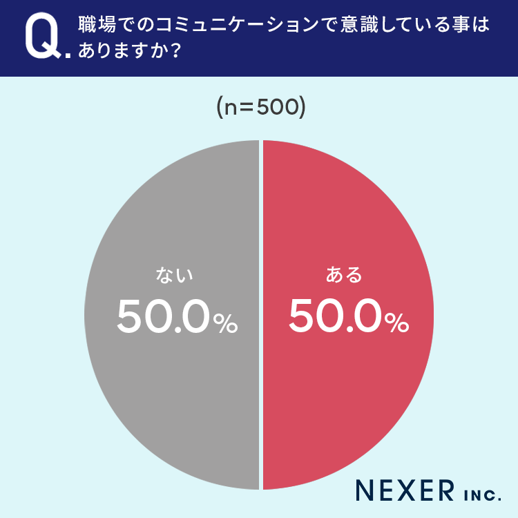 50%と半数の方が、職場でのコミュニケーションで意識している事が「ある」と回答しています。