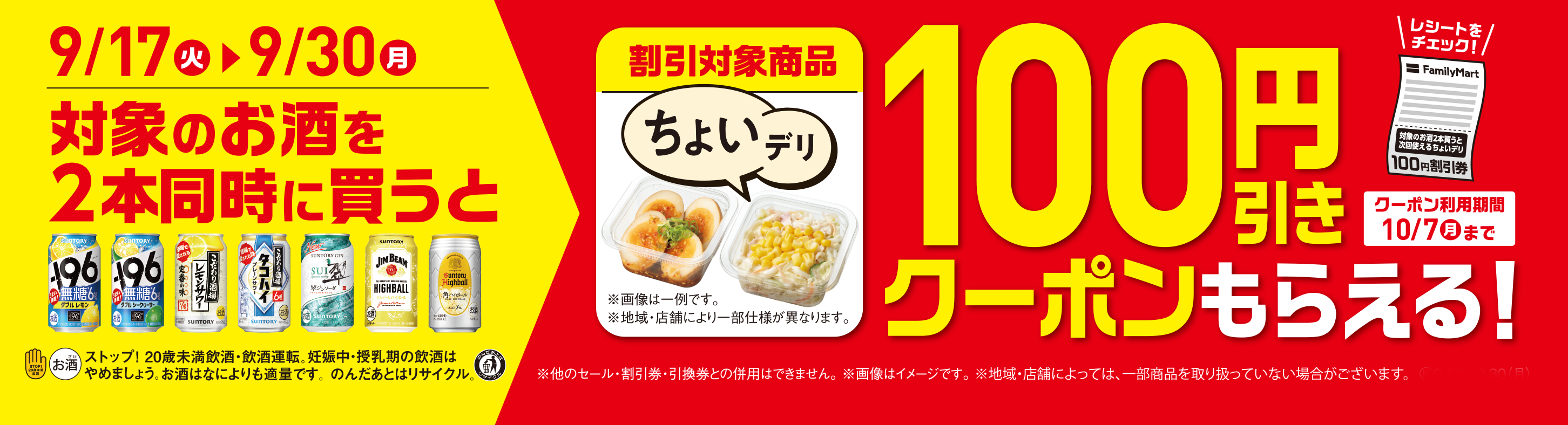 また、対象のお酒を2本ご購入いただくごとに「ちょいデリ」シリーズに使える100円引きレシートクーポンがもらえるキャンペーンを2024年9月17日(火)から2024年9月30日(月)まで、全国のファミリーマート酒類取扱店約15,800店にて実施いたします。