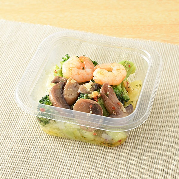 【内容】アヒージョの定番食材の海老とマッシュルーム、味なじみの良いブロッコリーとキャベツを使用しました。フライドガーリックやおろしにんにく、オレガノをあわせた香り豊かなガーリックオイルが楽しめます。