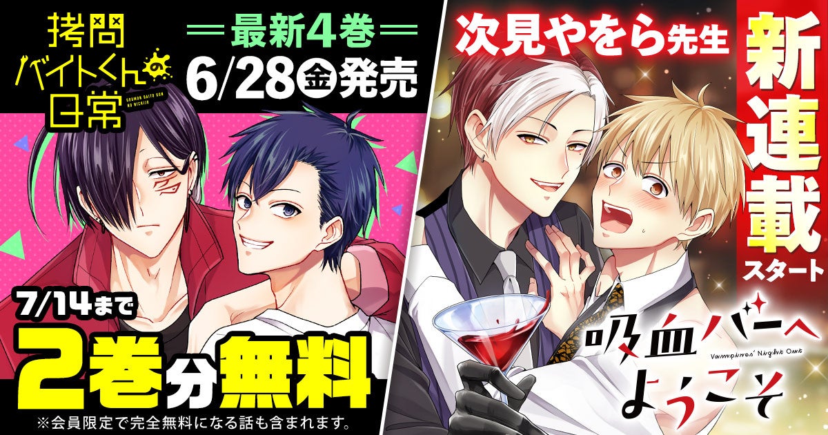 ヤングアニマルWebにて「拷問バイトくんの日常」の次見やをら先生の新連載BLコメディ「吸血バーへようこそ」がスタート&「拷問バイトくんの日常」最新④巻が6/28に発売!!