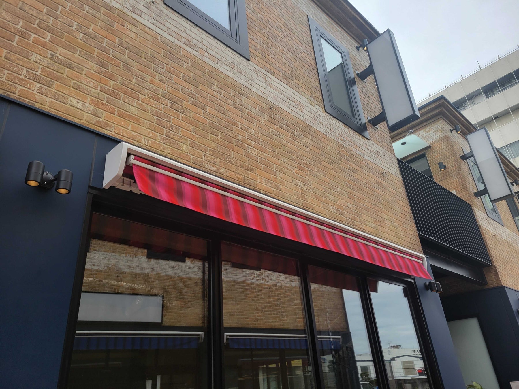 1階に設置されている日除けや雨除け目的のオーニングテントは、PETボトルリサイクル原着糸を使用した、環境に優しいファブリック調のテントを採用しております。防炎加工・撥水加工を施しているため、自然環境に配慮しつつも実用的なオーニングテントとなっております。