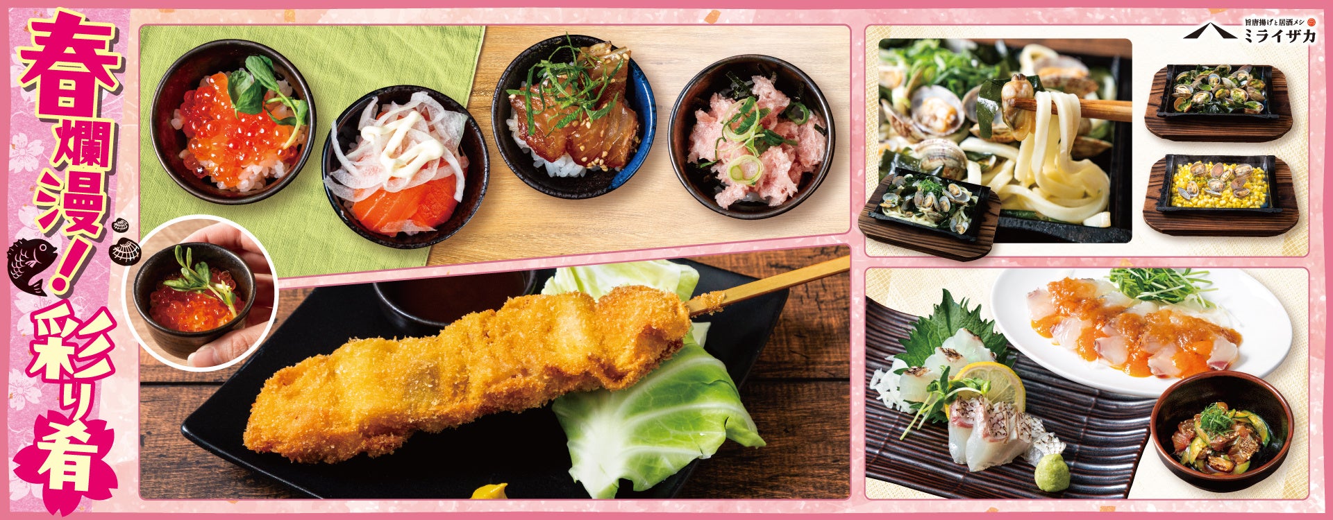 今回ミライザカでは※愛媛県宇和島産真鯛を使った刺身、カルパッチョやおちょこサイズのカップに入った「おちょこ寿司4品盛合せ」、冬の間に栄養をたっぷり蓄えた三陸産わかめの「三陸産わかめとあさりのジェノベーゼ炒め」「三陸産わかめとあさりのダシ旨塩バターうどん」など、春の味覚いっぱいのラインナップを取り揃えました。