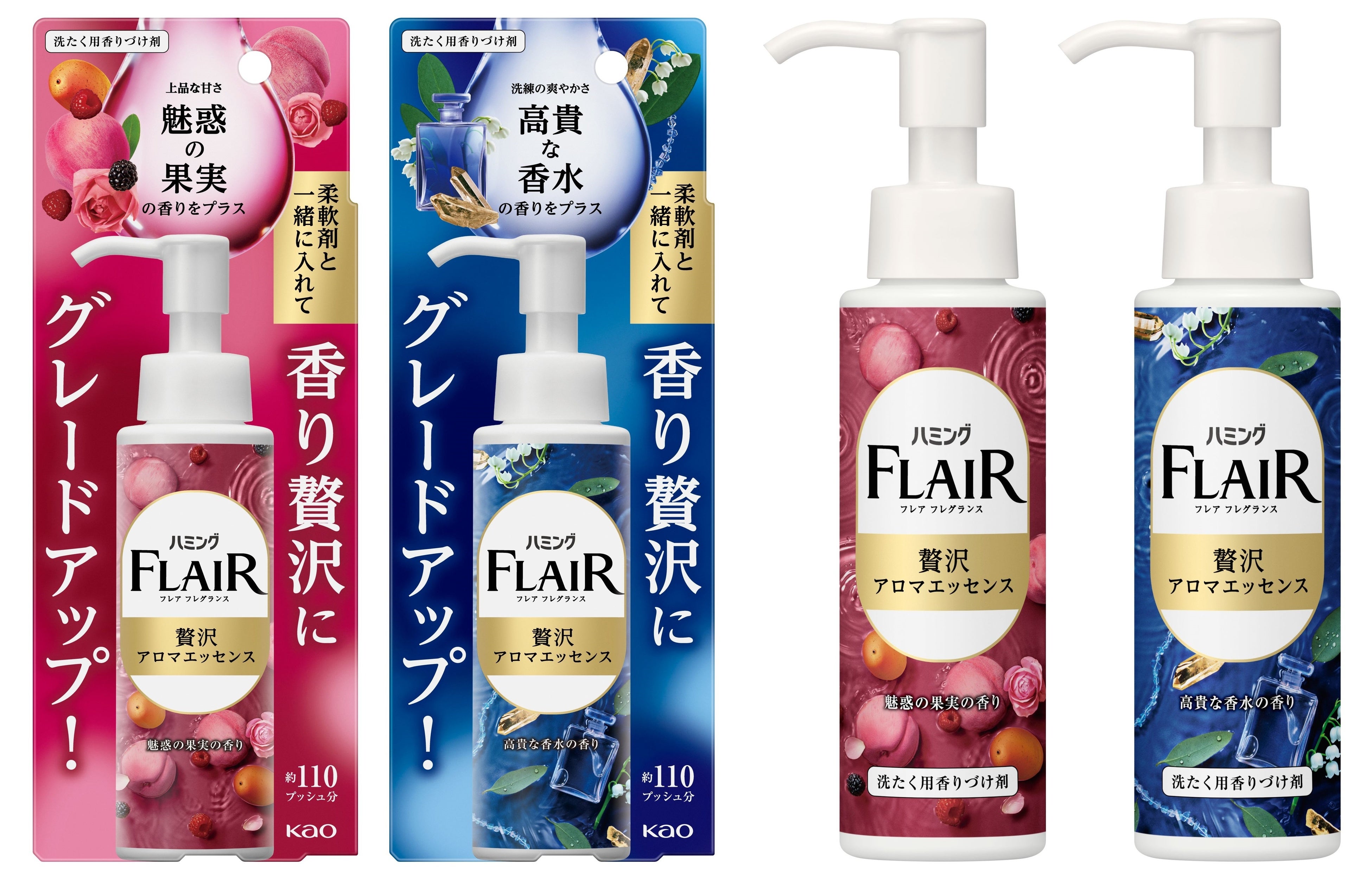 また、柔軟剤と一緒に入れて、贅沢にグレードアップした香りを楽しめる新アイテムとして、プッシュタイプの洗たく用香りづけ剤「ハミング フレア フレグランス 贅沢アロマエッセンス」も新発売します。上品な甘さにグレードアップする「魅惑の果実」の香りと、洗練の爽やかさにグレードアップする「高貴な香水」の香りの2香調をラインアップしました。