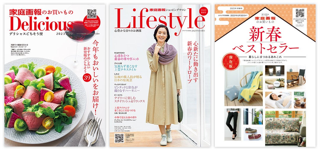 家庭画報ショッピングサロンは『デリシャスごちそう便』、『Lifestyle 心豊かな日々のお洒落』、『新春ベストセラー』の、2023新春号3カタログを発行、1月5日(木)より販売を開始しました。オンラインカタログでも注文を受け付けています。