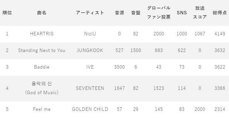 (※)各スコアの割合音源35%、音盤15%、グローバルファン投票(アプリ)20%、SNS10%、