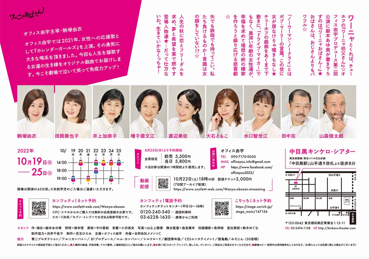 オフィス由宇プロデュース第二回公演『ワーニャおばさん!』が2022年10月19日(水)~10月25日(火)に中目黒 キンケロ・シアター (東京都目黒区青葉台1-15-11)にて上演されます。チケットはカンフェティ(運営:ロングランプランニング株式会社、東京都新宿区、代表取締役:榑松 大剛)にて8月25日(木)10:00より発売開始です。