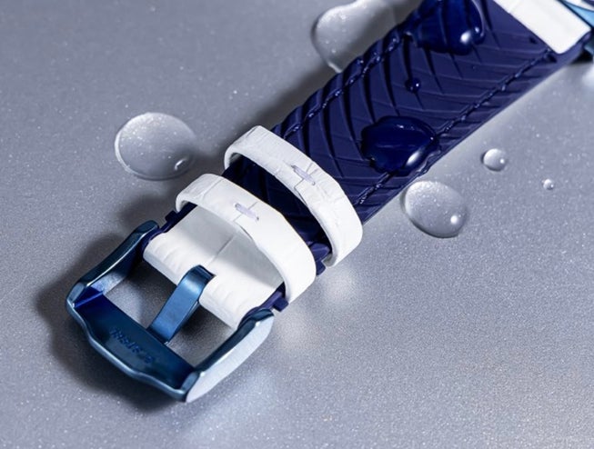 レザーのベルトの裏面はシリコンを圧着させたハイブリッドベルト。軽量かつ撥水、耐久性に優れ、装着感もすこぶる快適。また汗や水によるベルトの変形も防ぐことができるメリットもあり。
