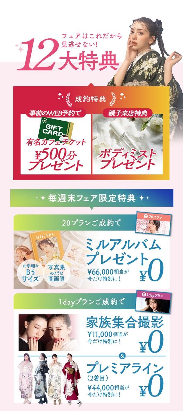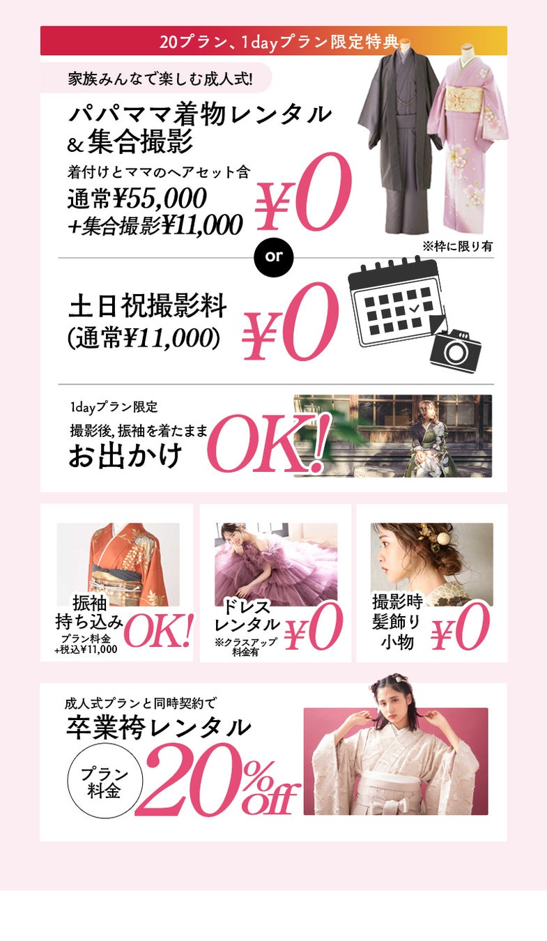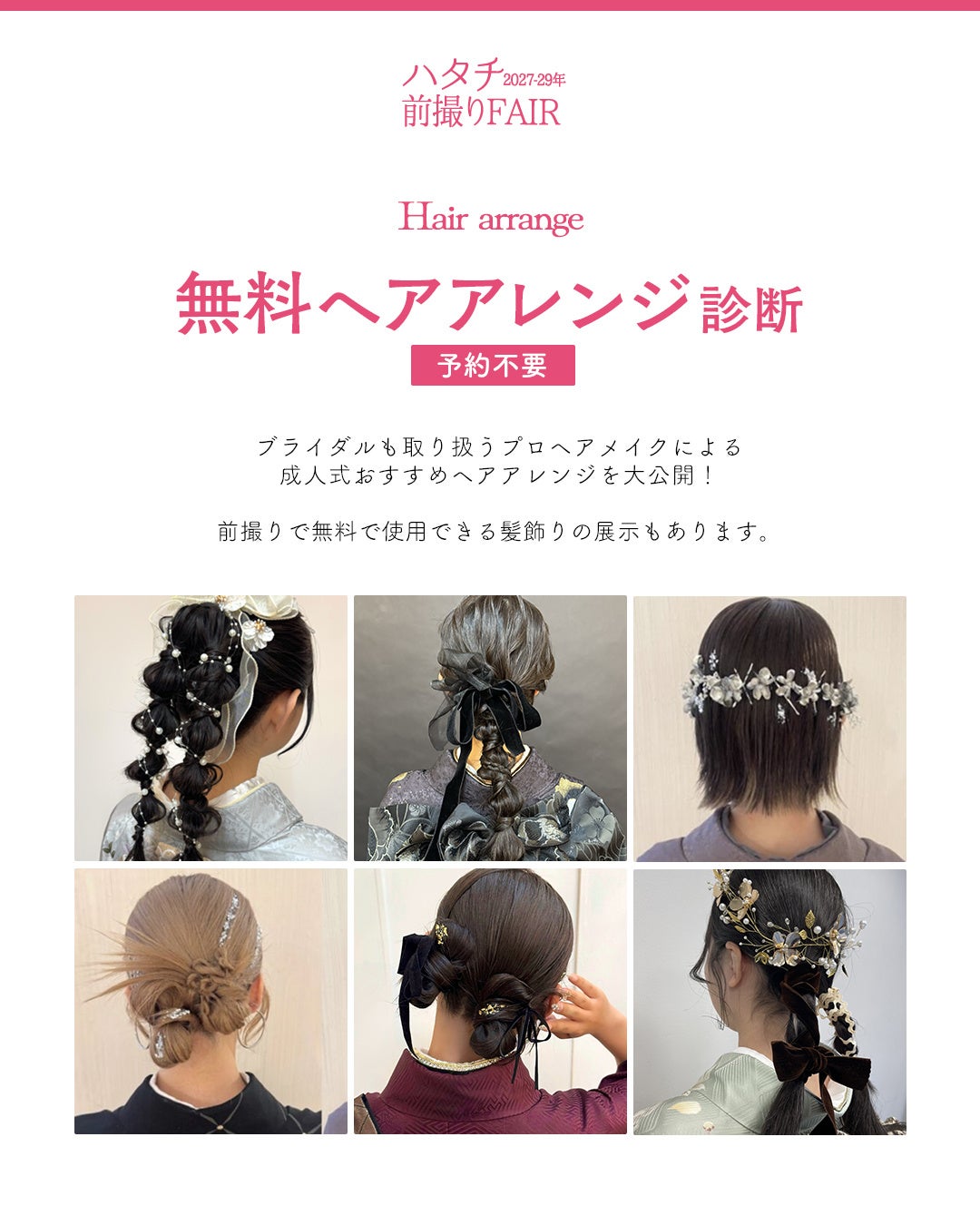 このほか、成人式当日の振袖レンタルとのセットなど、希望に合わせた複数プランを取り揃え、最適な組み合わせをご提案します。
