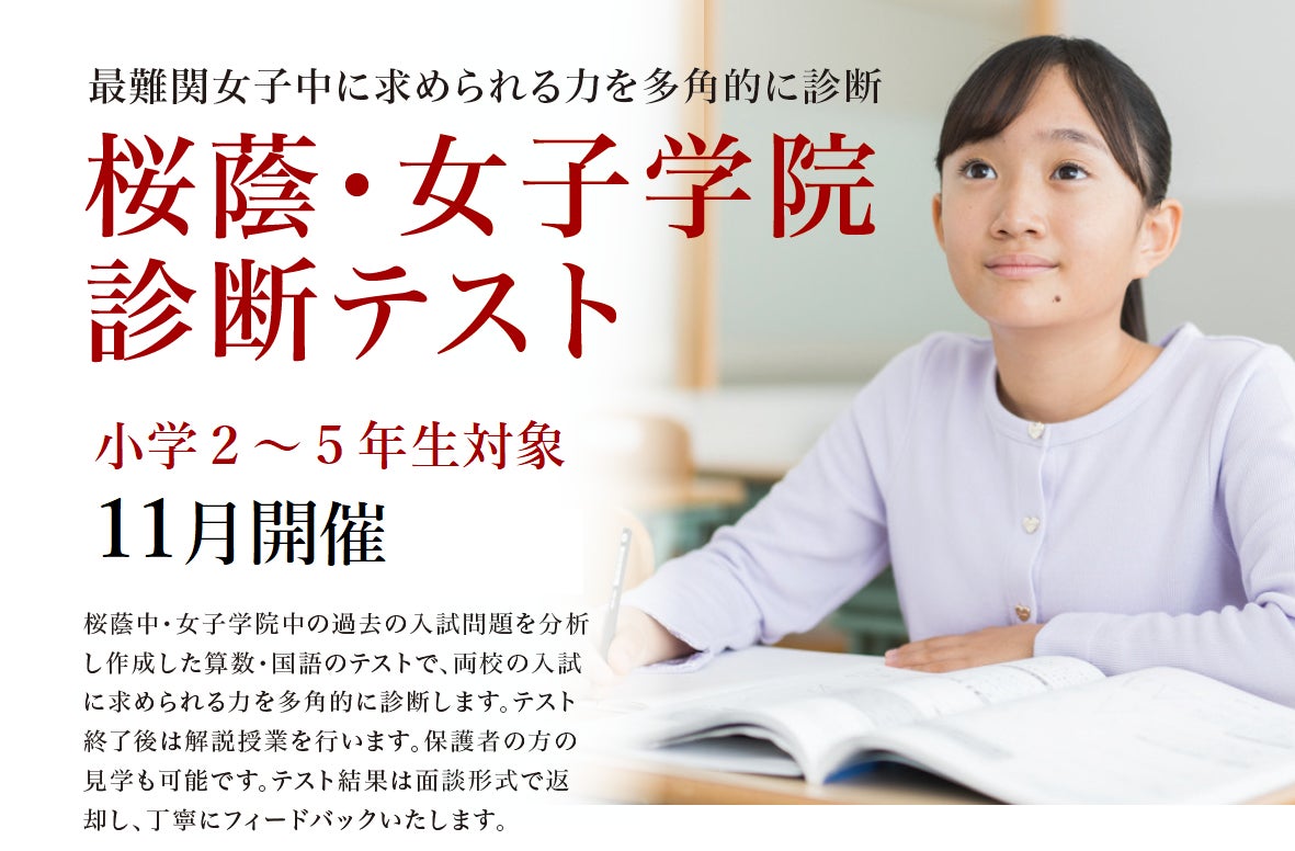 株式会社増進会ホールディングス(Z会グループ)のグループ会社、株式会社栄光(本社:東京都千代田区 代表取締役社長:下田勝昭)が運営する進学塾「栄光ゼミナール中野校 最難関女子中学受験専門館」は、桜蔭中・女子学院中を目指す小学2~5年生を対象に、「桜蔭・女子学院診断テスト」を2025年11月に開催します。