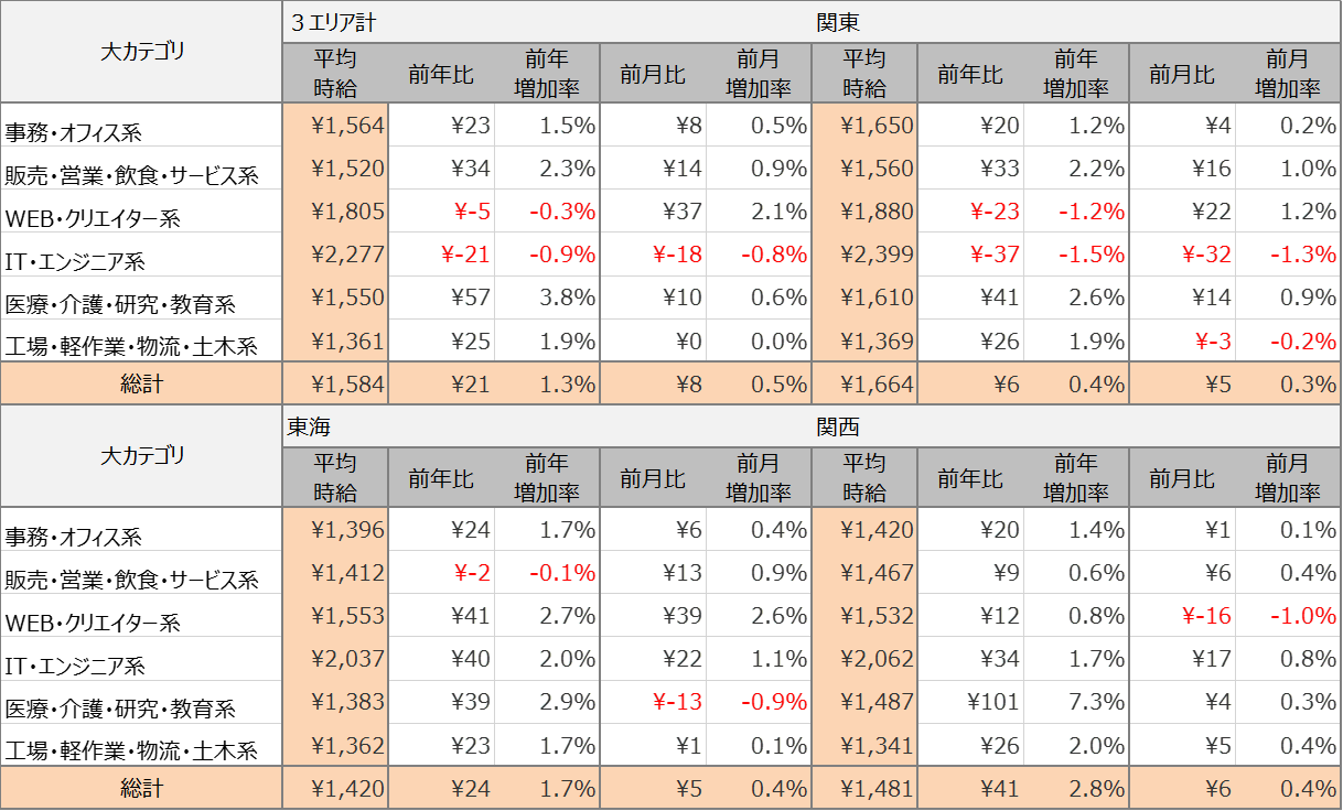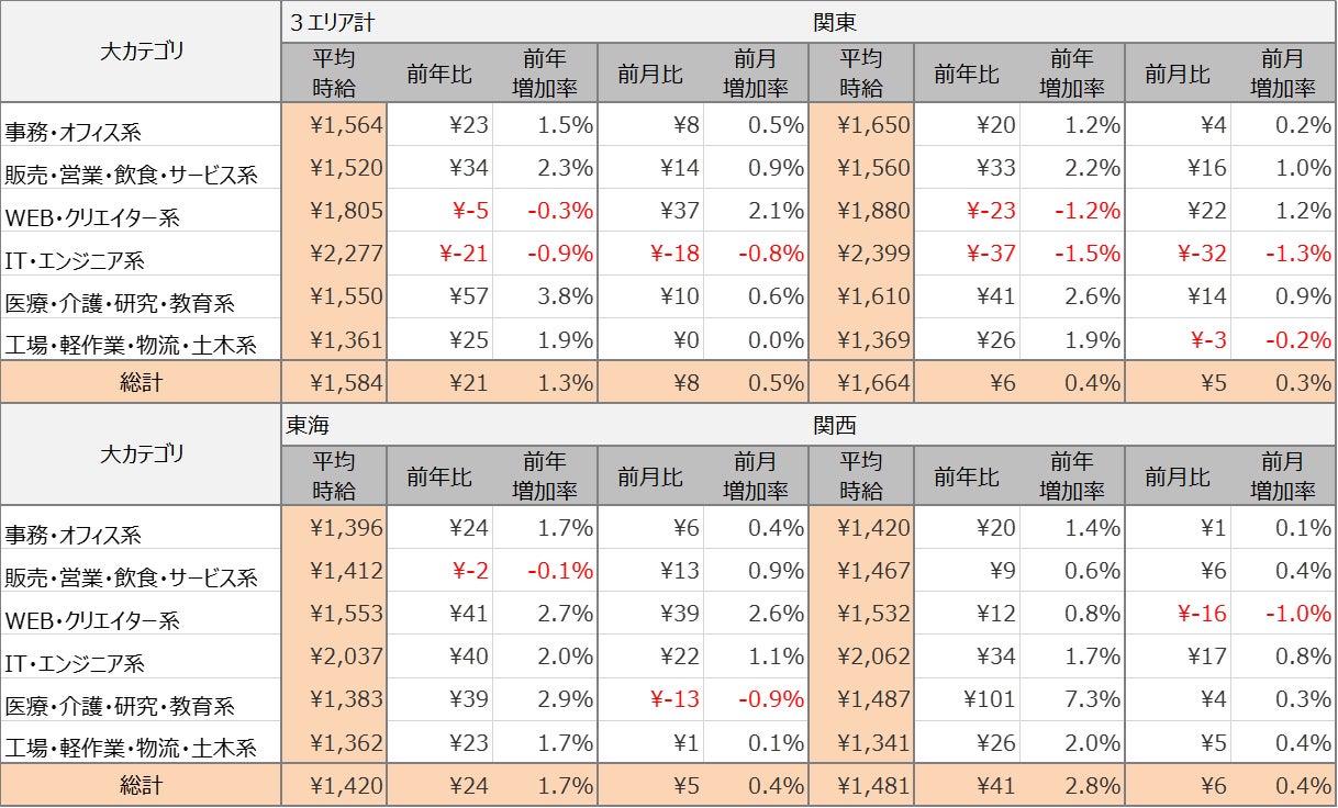 各エリアの平均時給について、関東エリアは1,664円(前年比6円増、前月比5円増)、東海エリアは1,420円(前年比24円増、前月比5円増)、関西エリアは1,481円(前年比41円増、前月比6円増)となりました。
