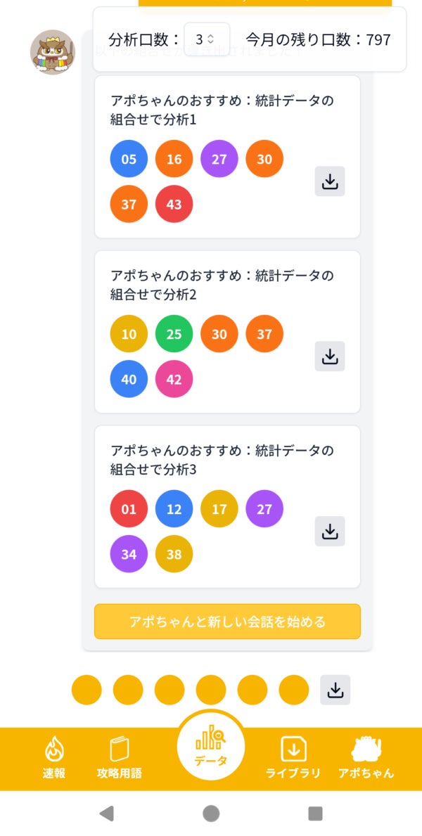 本サービスの目玉機能であるAIチャットボット「アポちゃん」は、ミニロト・ロト6・ロト7の第1回からの当せん数字はもちろん、「連続数字」「下ヒトケタ共通」といったロト上級者向けのさまざまなデータも学習しており、過去データの分析結果を瞬時に提示してくれる。