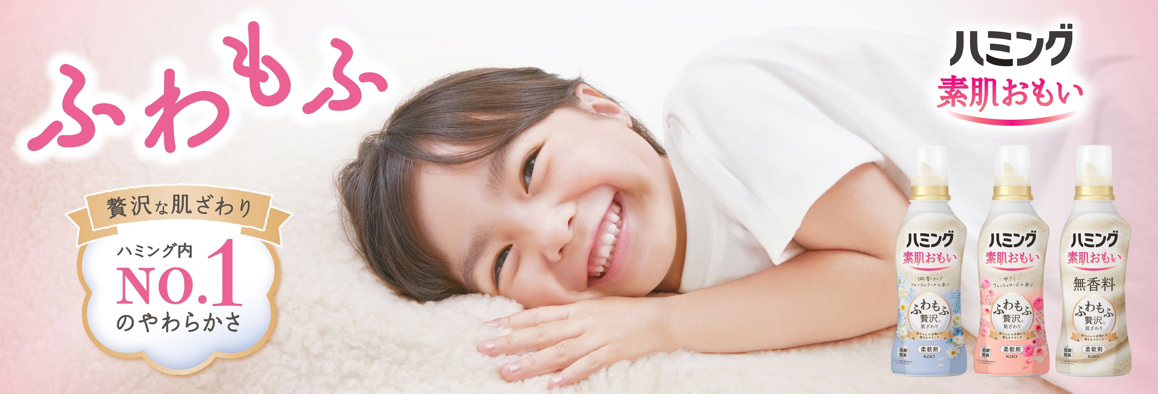 衣類の快適性を追求してきた「ハミング」は、1962年に日本初の柔軟剤として誕生(1966年に「花王ソフター」から「ハミング」へ改称)し、定番商品としてご愛用いただいています。このたび新しくなった「ハミング 素肌おもい」は、天然由来の柔軟成分を増量*1 し、“ふわもふ”で贅沢な肌ざわりを実現。ハミング内No.1のやわらかさです。