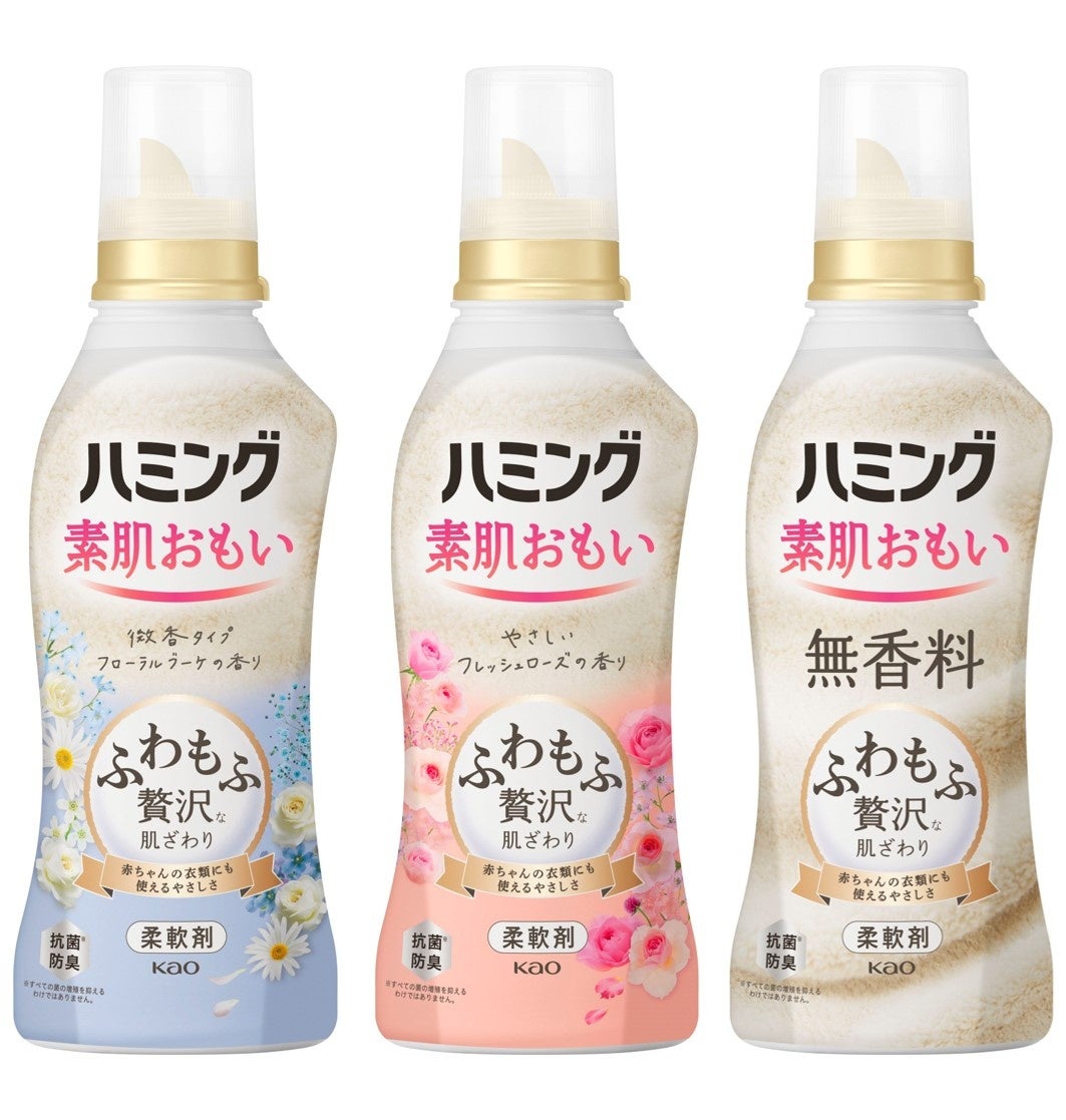 「ハミング 素肌おもい」は、赤ちゃんの衣類にも使える肌ざわりのやわらかさはもちろん、香りによって選べる3つのラインアップを揃えています。香料無添加の「無香料」、微香タイプの「フローラルブーケの香り」、そしてこのたびよりみずみずしくフレッシュなローズの香りへと改良した「フレッシュローズの香り」の3タイプです。