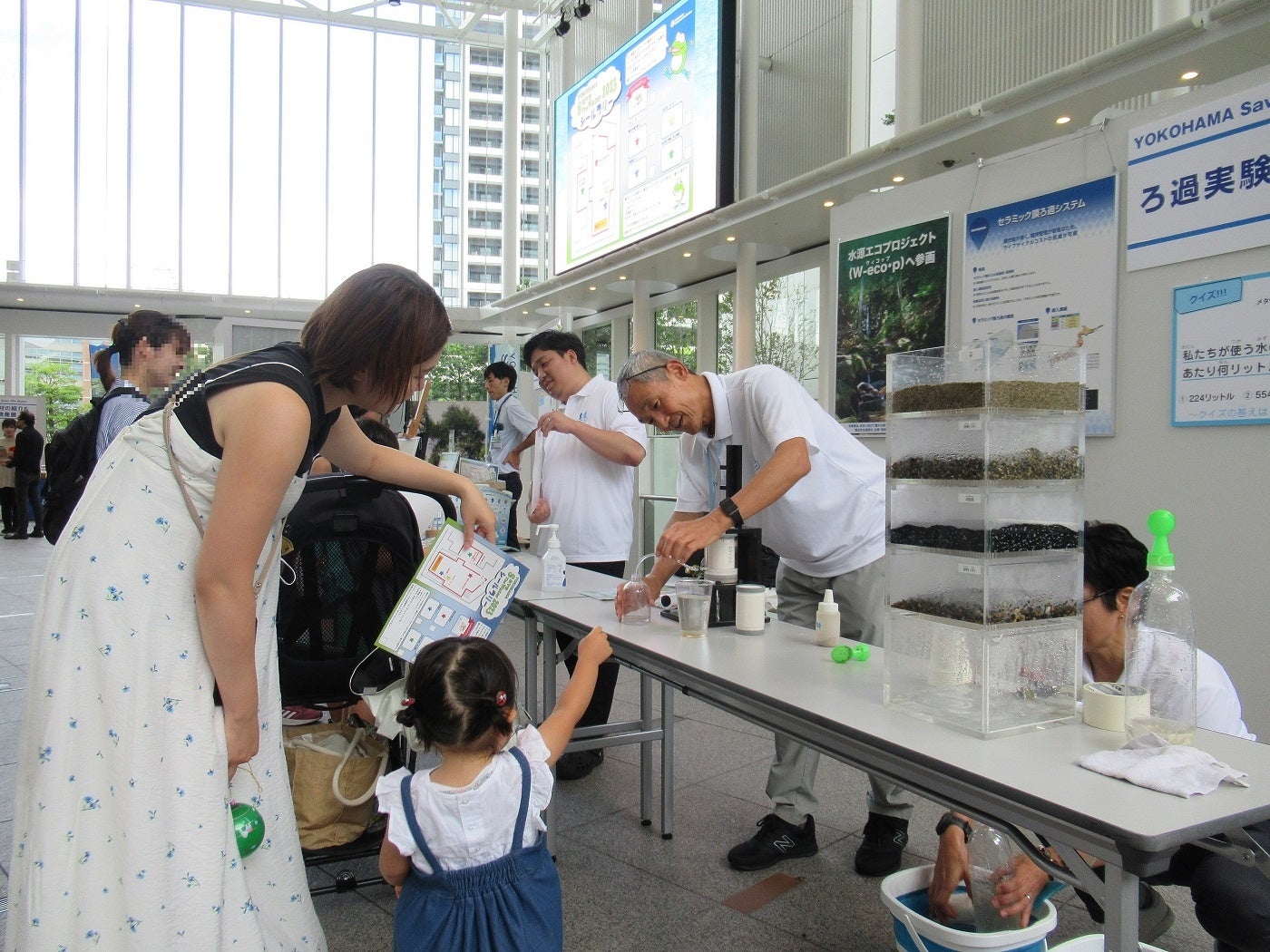 川井浄水場を管理・運営しているメタウォーター株式会社によるブースです。水源から運ばれてきた水が、浄水場でどのようにきれいになるのかを、実験キットを使って学習できます。