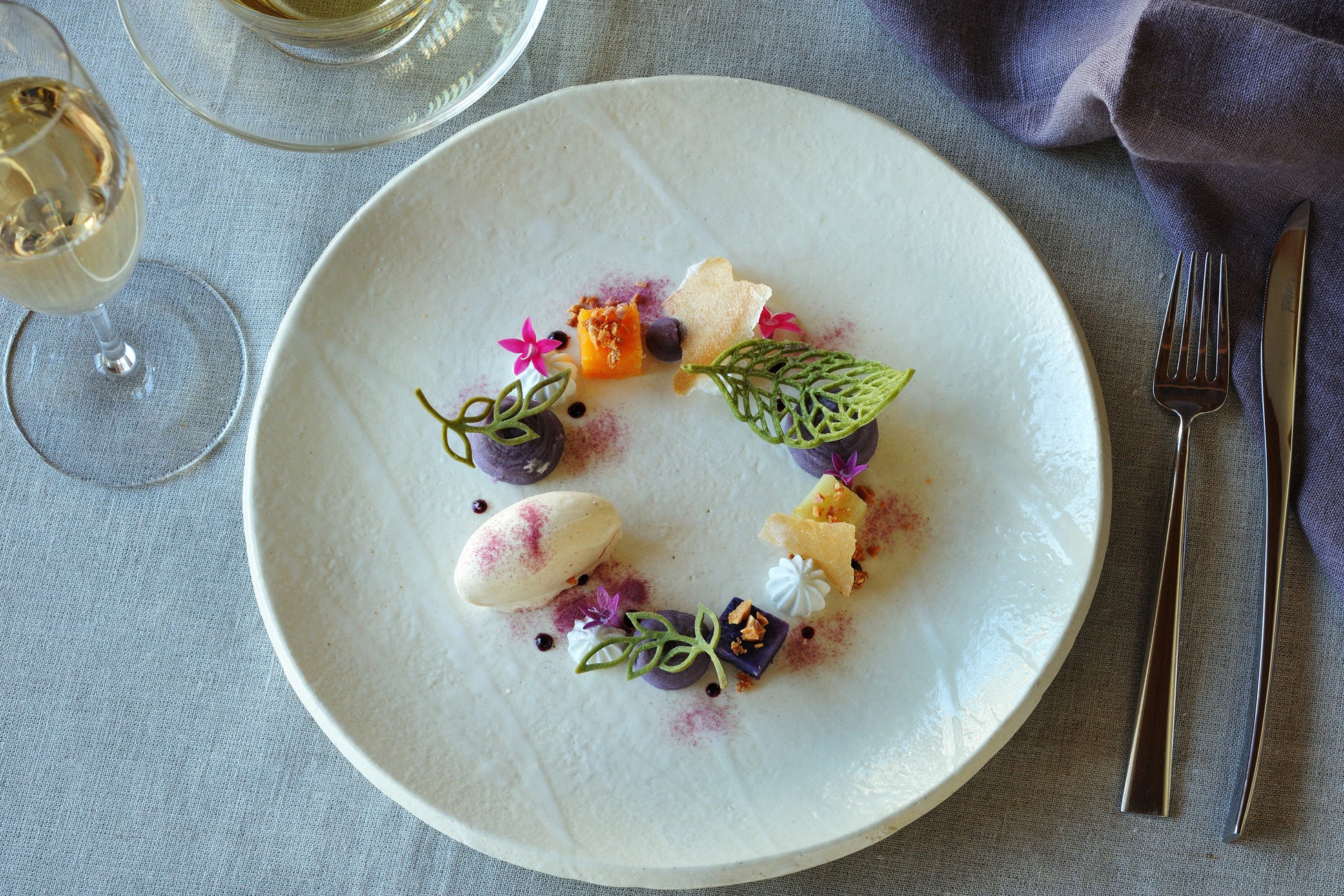 デザートコースは品種ごとの味わいを知る「紅芋テイスティング」からスタート。はじめに、豊富な品種の中からシェフが食べ頃に合わせて選んだ3種をシンプルに味わい、風味や食感を確かめます。続いて各品種の個性を活かしたプティフールで味わい、シェフの技に触れます。例えば、粘り気と強い甘さが特徴の「ニライむらさき」はフロマージュに合わせる他、人参のような甘みが特徴の「読谷あかね」はブリュレに仕立てました。生の紅芋は沖縄県外への持ち出しができないため(*1)、ここでしか味わえない楽しみ方で、紅芋の奥深さに触れることができます。