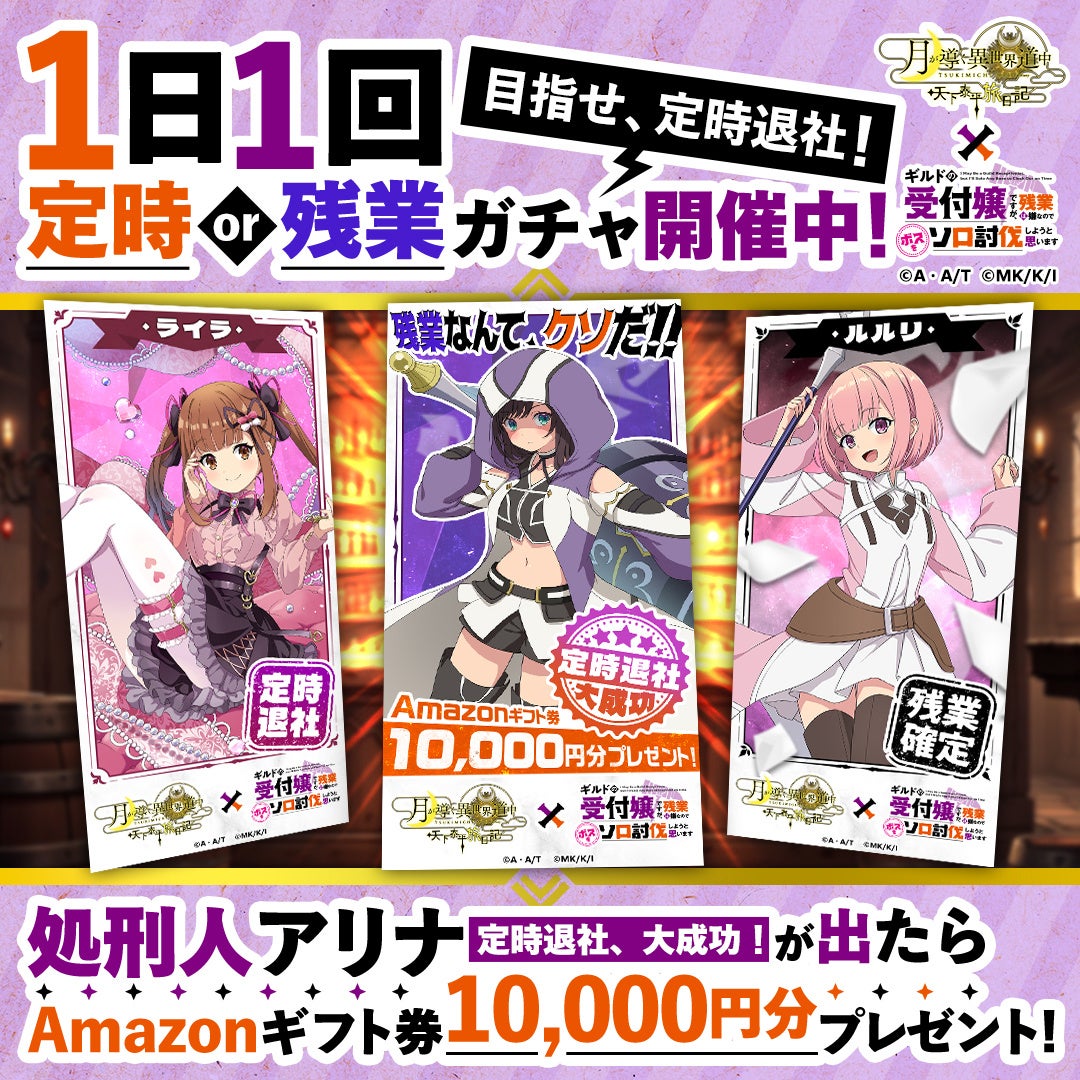 「処刑人アリナ」が出たら、「定時退社、大成功!」 記念としてAmazonギフト券10,000円をプレゼント!毎日1回参加して、全イラストのコンプリートを目指しましょう!