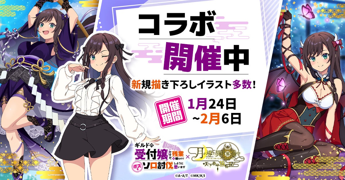 CTW株式会社は、「G123」にて配信中のHTML5ゲーム『月が導く異世界道中 天下泰平旅日記』で、新作アニメ『ギルドの受付嬢ですが、残業は嫌なのでボスをソロ討伐しようと思います』とのコラボイベントを本日より開催します。