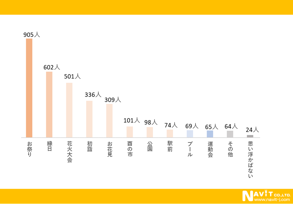 「屋台といわれて思い浮かぶ場所は何ですか?」という質問を複数選択可能で行ったところ、「お祭り」が905人、「縁日」が602人、「花火大会」が501人という順になりました。